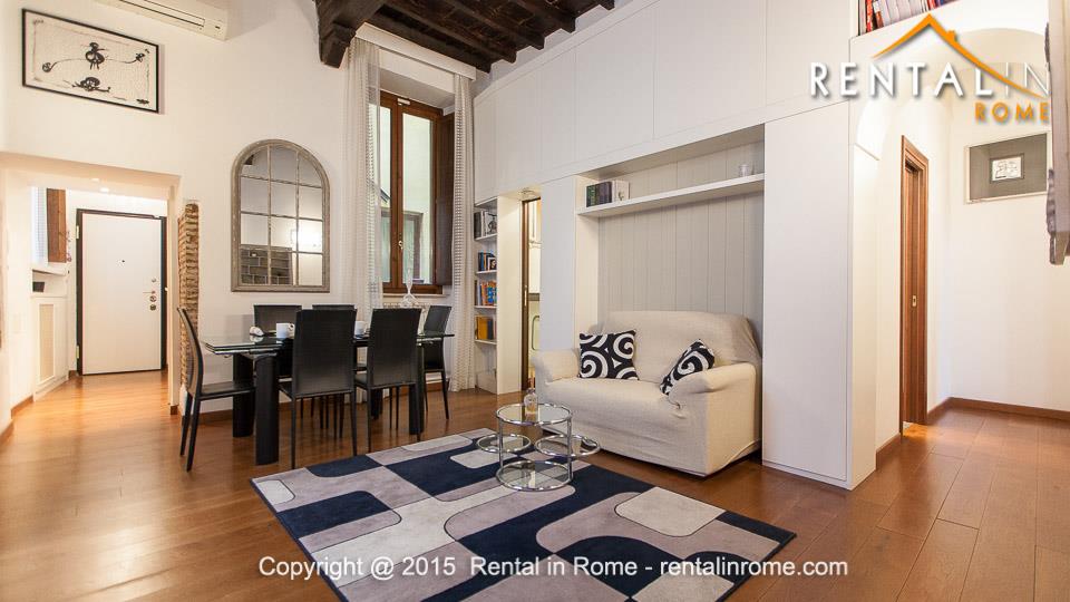 Maravilloso apartamento situado en el centro de Roma, Via Arco di Santa Margherita, a pocos pasos de Campo de 'Fiori y Piazza Navona. El apartamento ha sido renovado recientemente y tiene vistas sobre el trabajo de la Virgen de Santa Margherita, una obra que data de principios del 700, se encuentra en la primera planta de un edificio antiguo. Salón con sofá, zona de comedor y semi-habitable cocina cocina totalmente equipada, un dormitorio doble con armario empotrado y una habitación con dos camas individuales, baño amplio y moderno con ducha. Es equipado con todas las comodidades como aire acondicionado en todas las habitaciones, Internet inalámbrico, TV de plasma vía satélite, equipo de música, excelente diseño y antigüedades lavastoviglie.Arredamento moderno, techos de madera, suelos de parquet en todas las habitaciones y una ubicación estratégica para el recorrido a pie por el casco antiguo de este apartamento de lujo.