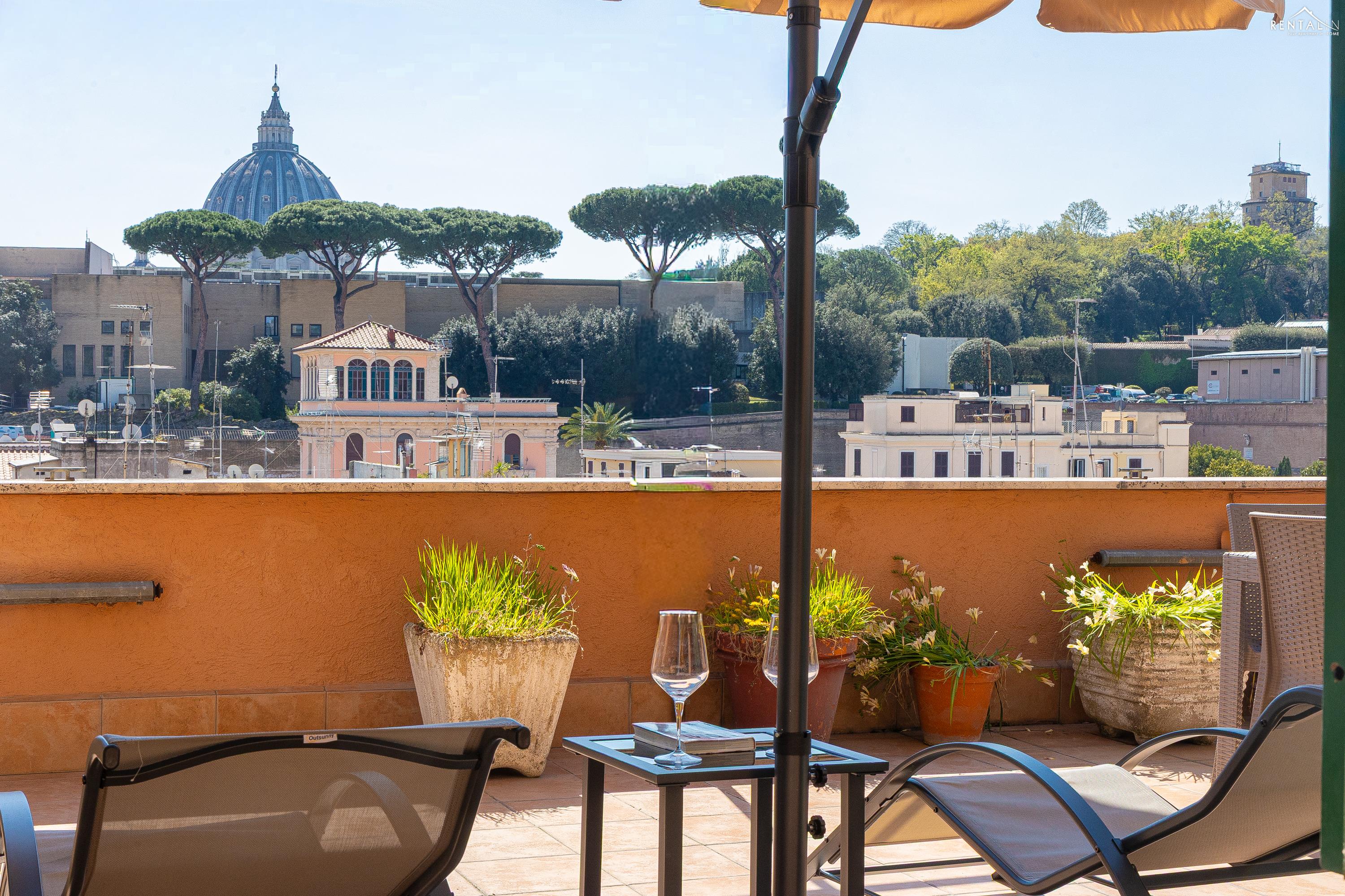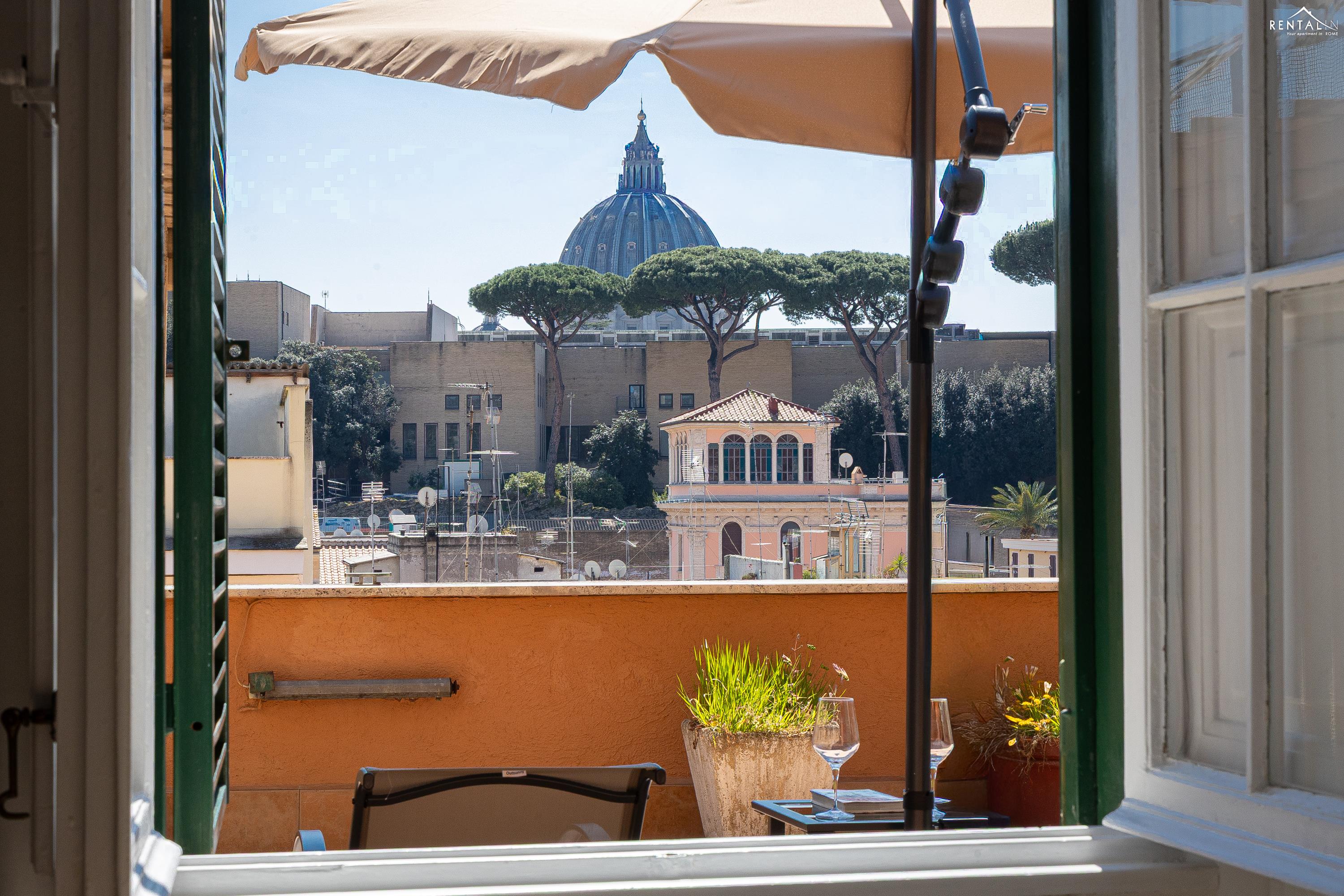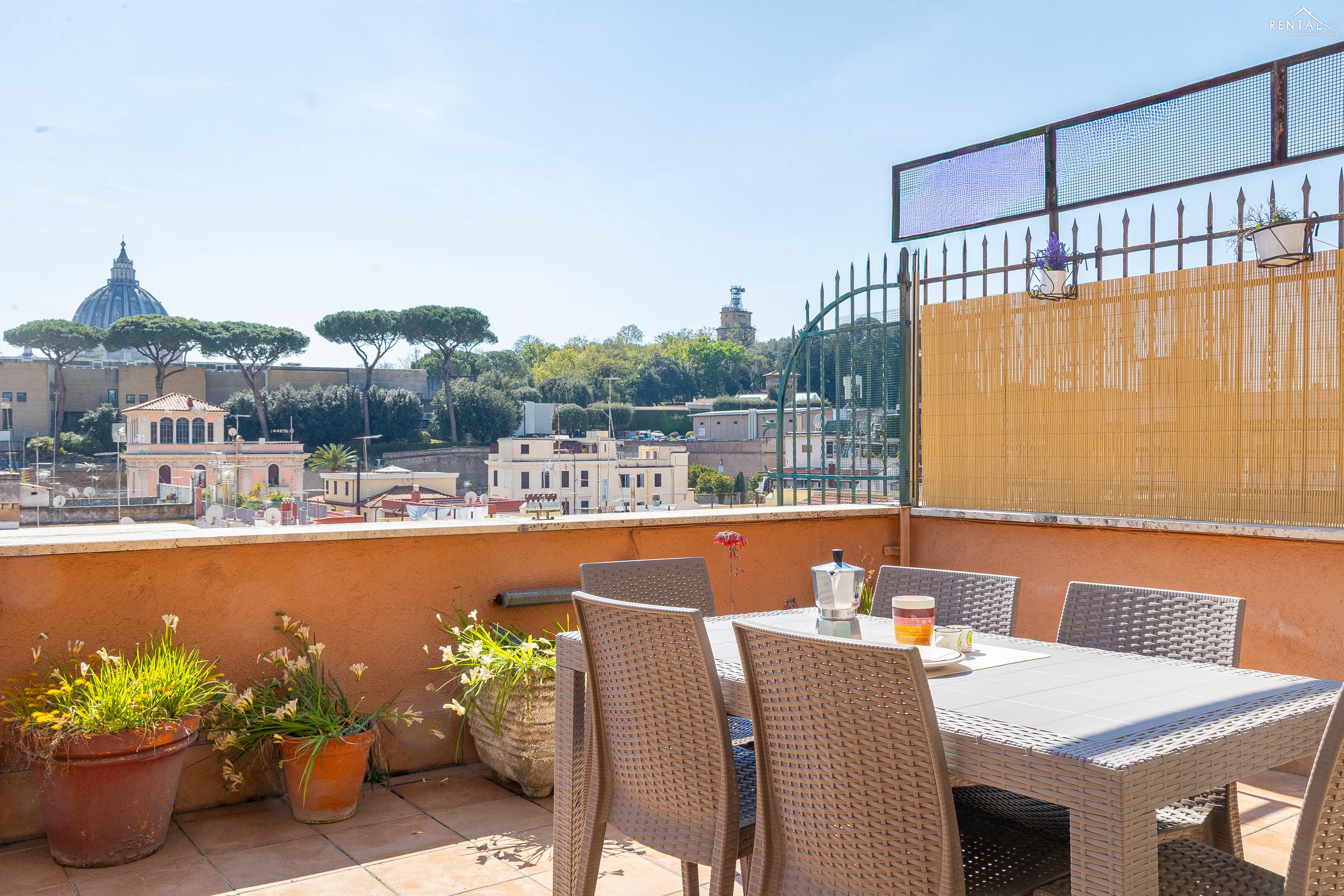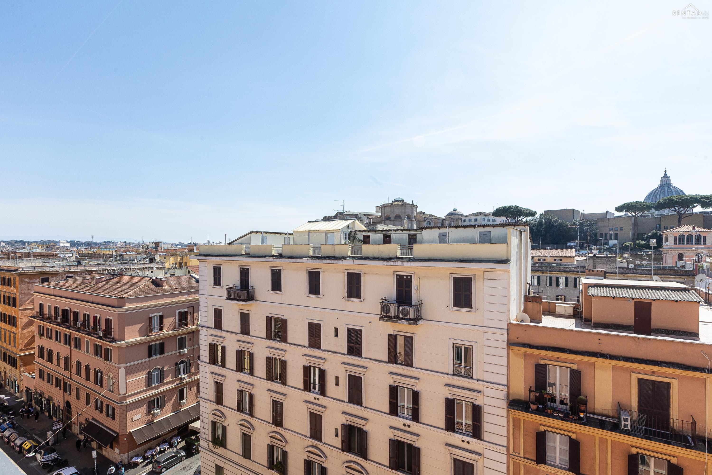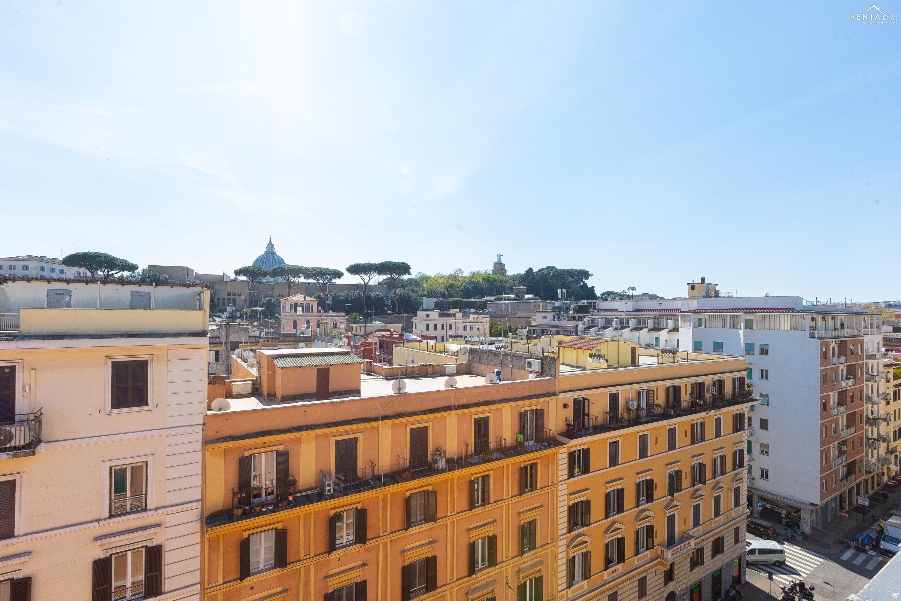 Gezellig appartement op de zevende verdieping van een gebouw met lift in Via la Goletta, in de elegante wijk Prati, op korte afstand van Sint Pieter Basiliek en de Vaticaanse Musea. Het is ingericht op een manier die modern en functioneel combineert en bestaat uit een slaapkamer met tweepersoonsbed, een woonkamer met een slaapbank en een keuken met moderne apparatuur, een badkamer met douche en een groot terras, ideaal om buiten te eten of te ontspannen de zon met een prachtig uitzicht over de daken van de stad en de koepel van de Sint Pieter. De voorzieningen zijn WiFi, een lcd-tv, een wasmachine en een kluisje. De centrale ligging met goede bereikbaarheid met het openbaar vervoer (metrolijn A Cipro is dichtbij) maakt het bij uitstek geschikt voor een aangename vakantie in de Eeuwige Stad.