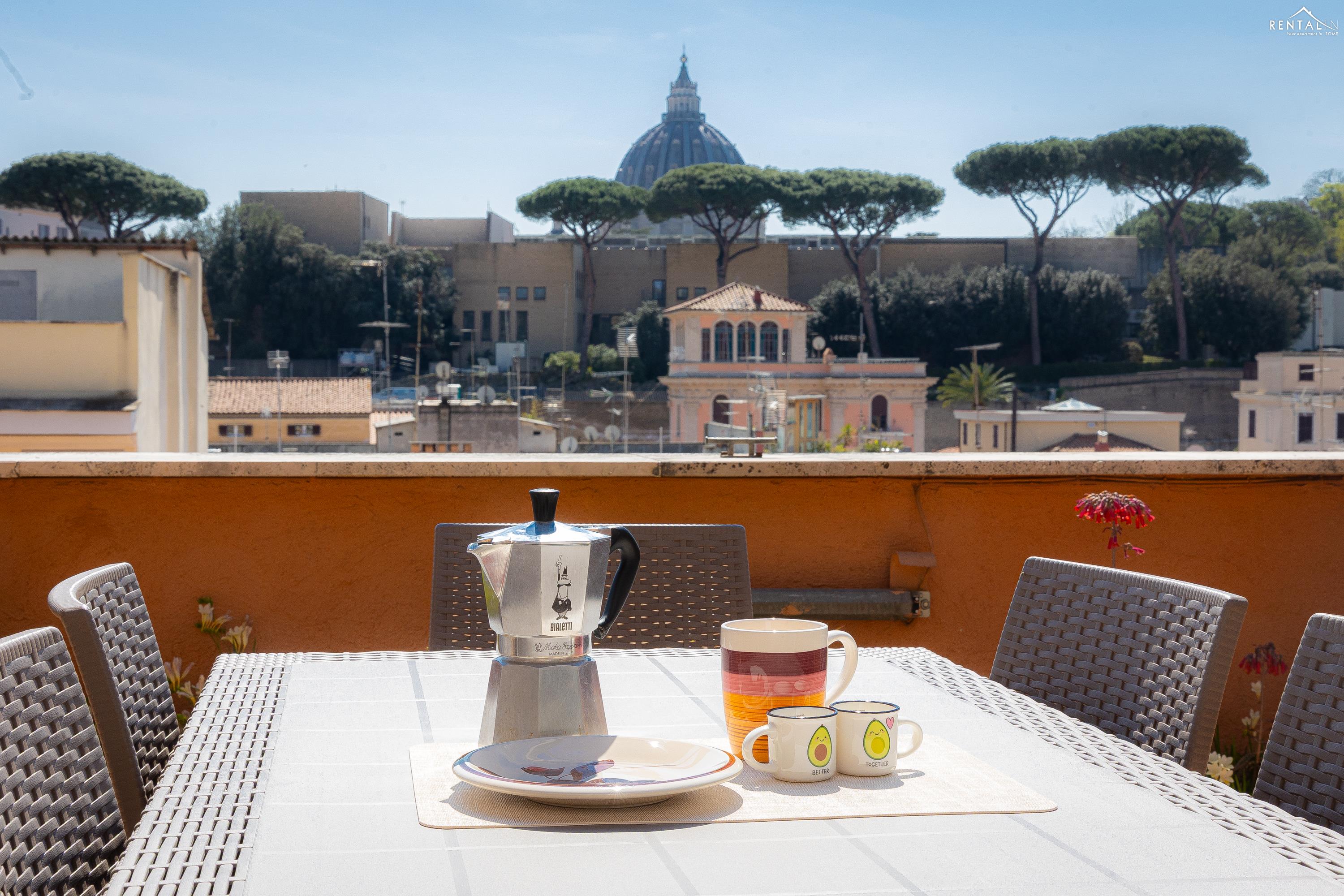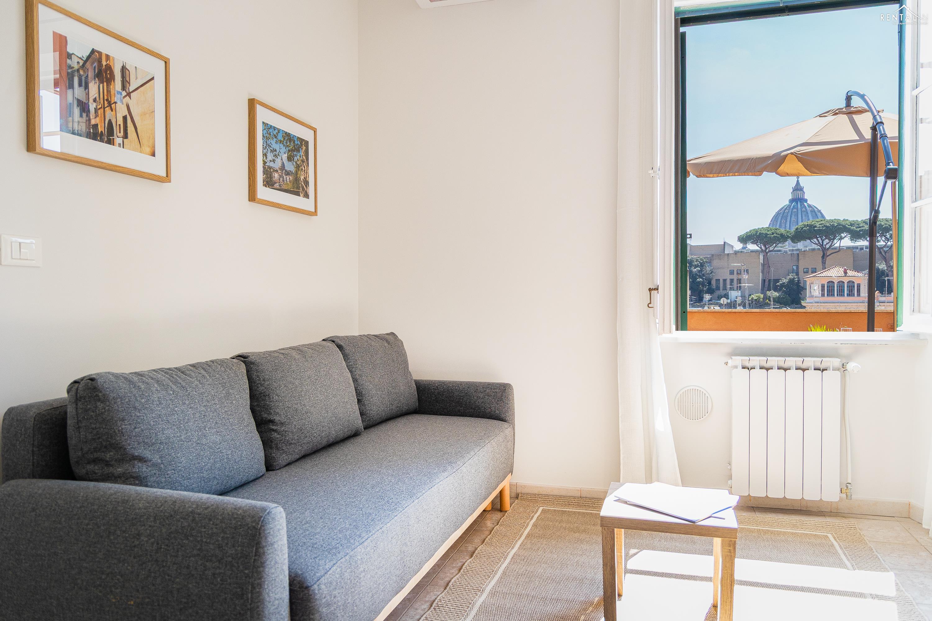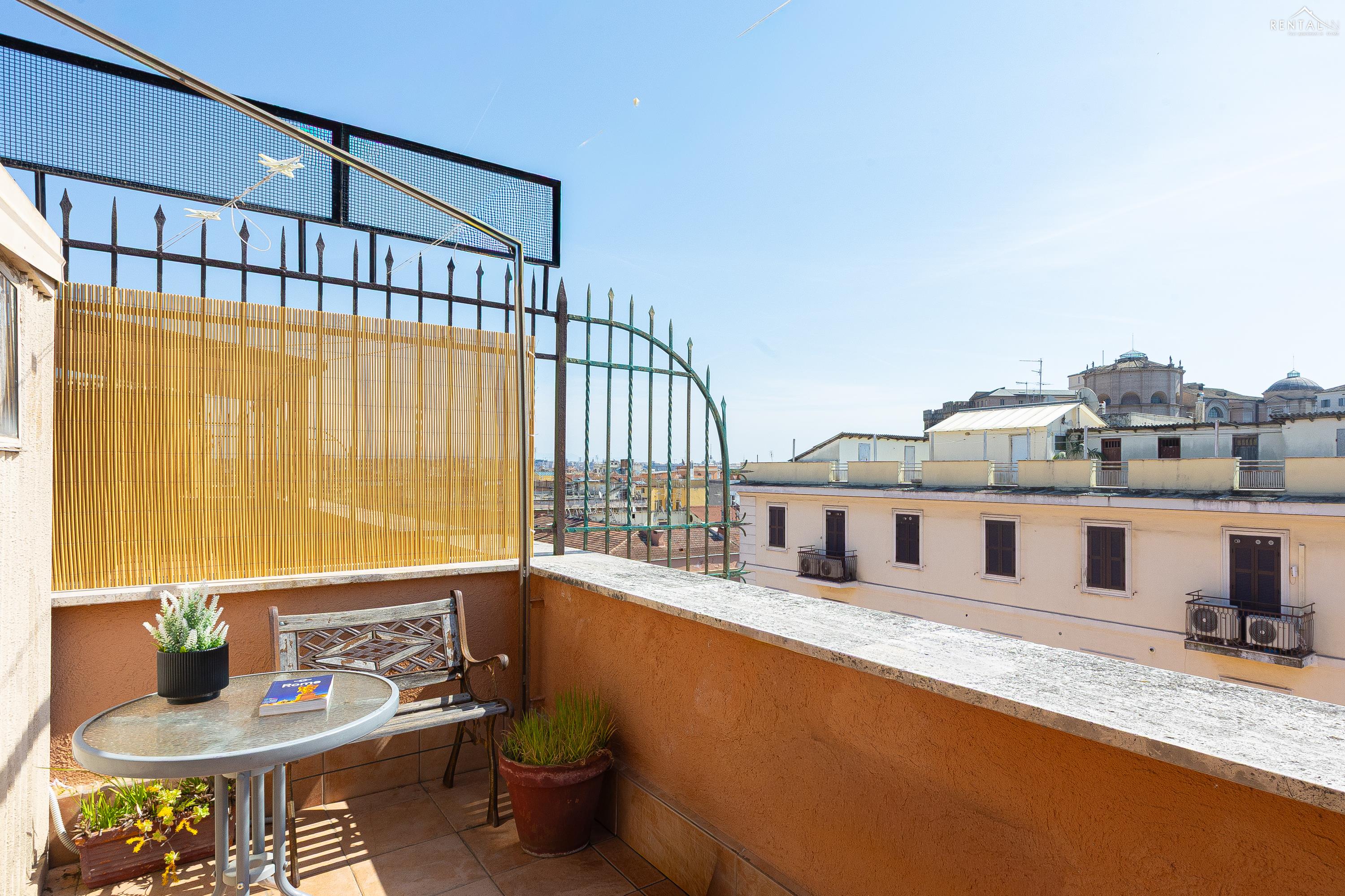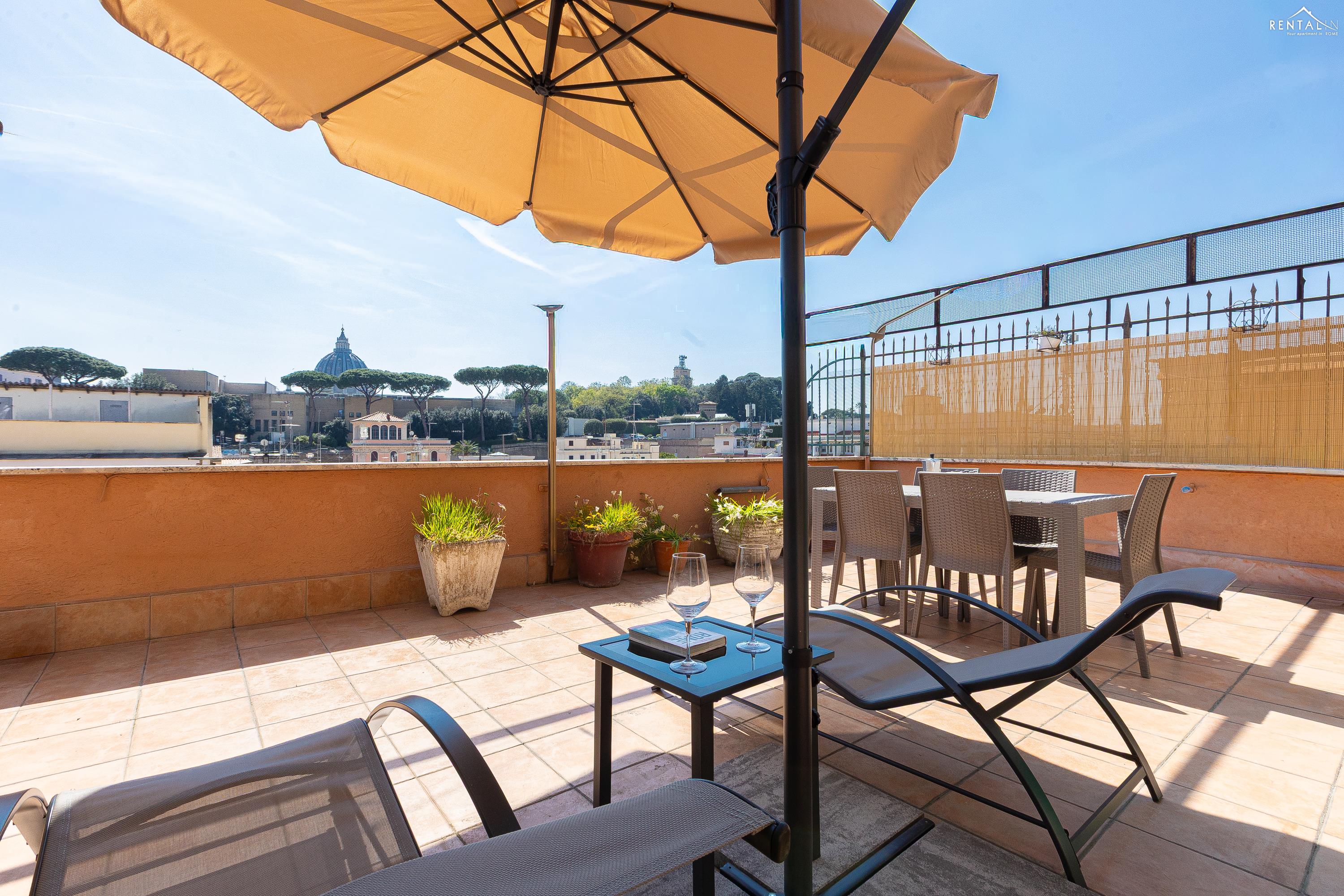 Gezellig appartement op de zevende verdieping van een gebouw met lift in Via la Goletta, in de elegante wijk Prati, op korte afstand van Sint Pieter Basiliek en de Vaticaanse Musea. Het is ingericht op een manier die modern en functioneel combineert en bestaat uit een slaapkamer met tweepersoonsbed, een woonkamer met een slaapbank en een keuken met moderne apparatuur, een badkamer met douche en een groot terras, ideaal om buiten te eten of te ontspannen de zon met een prachtig uitzicht over de daken van de stad en de koepel van de Sint Pieter. De voorzieningen zijn WiFi, een lcd-tv, een wasmachine en een kluisje. De centrale ligging met goede bereikbaarheid met het openbaar vervoer (metrolijn A Cipro is dichtbij) maakt het bij uitstek geschikt voor een aangename vakantie in de Eeuwige Stad.