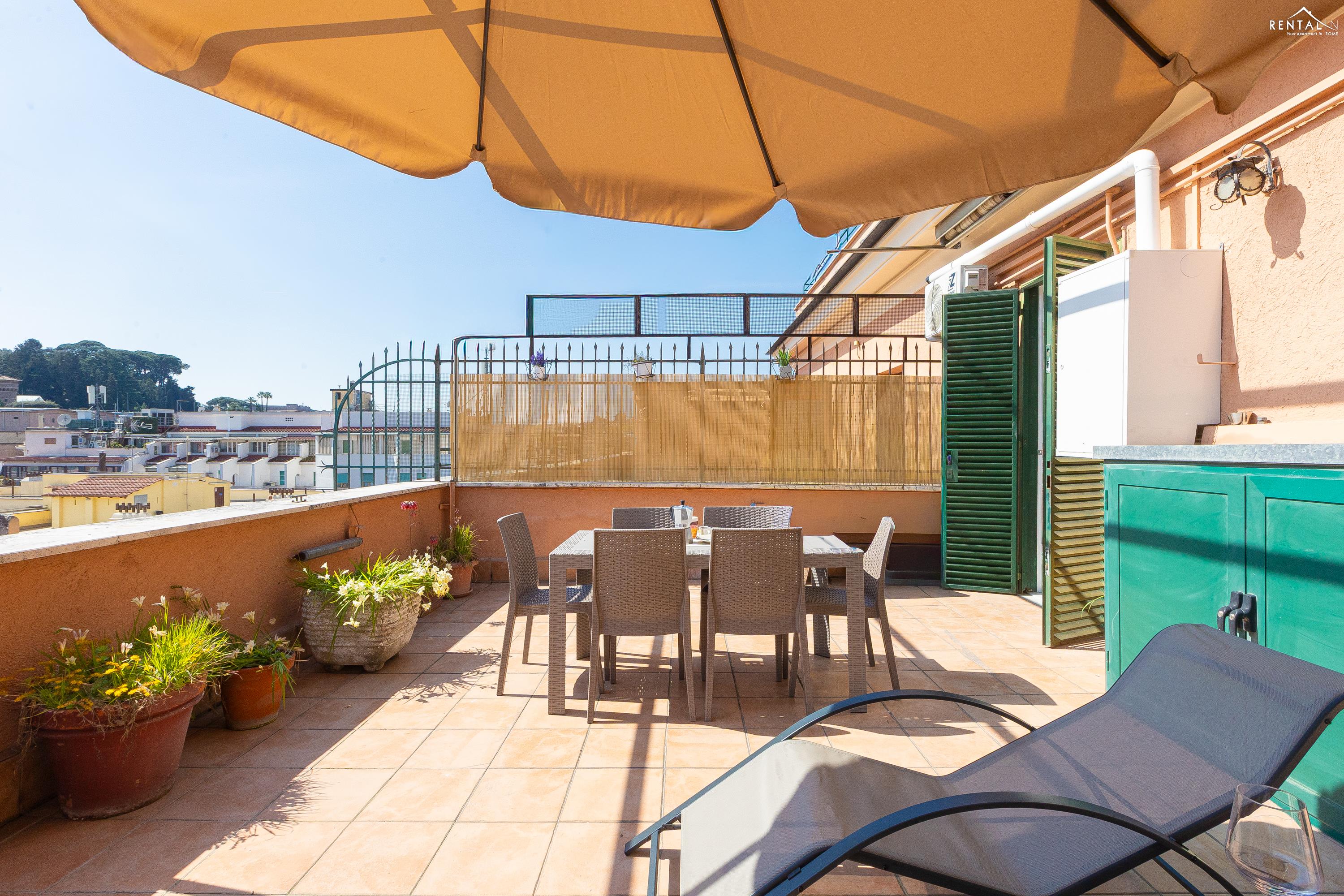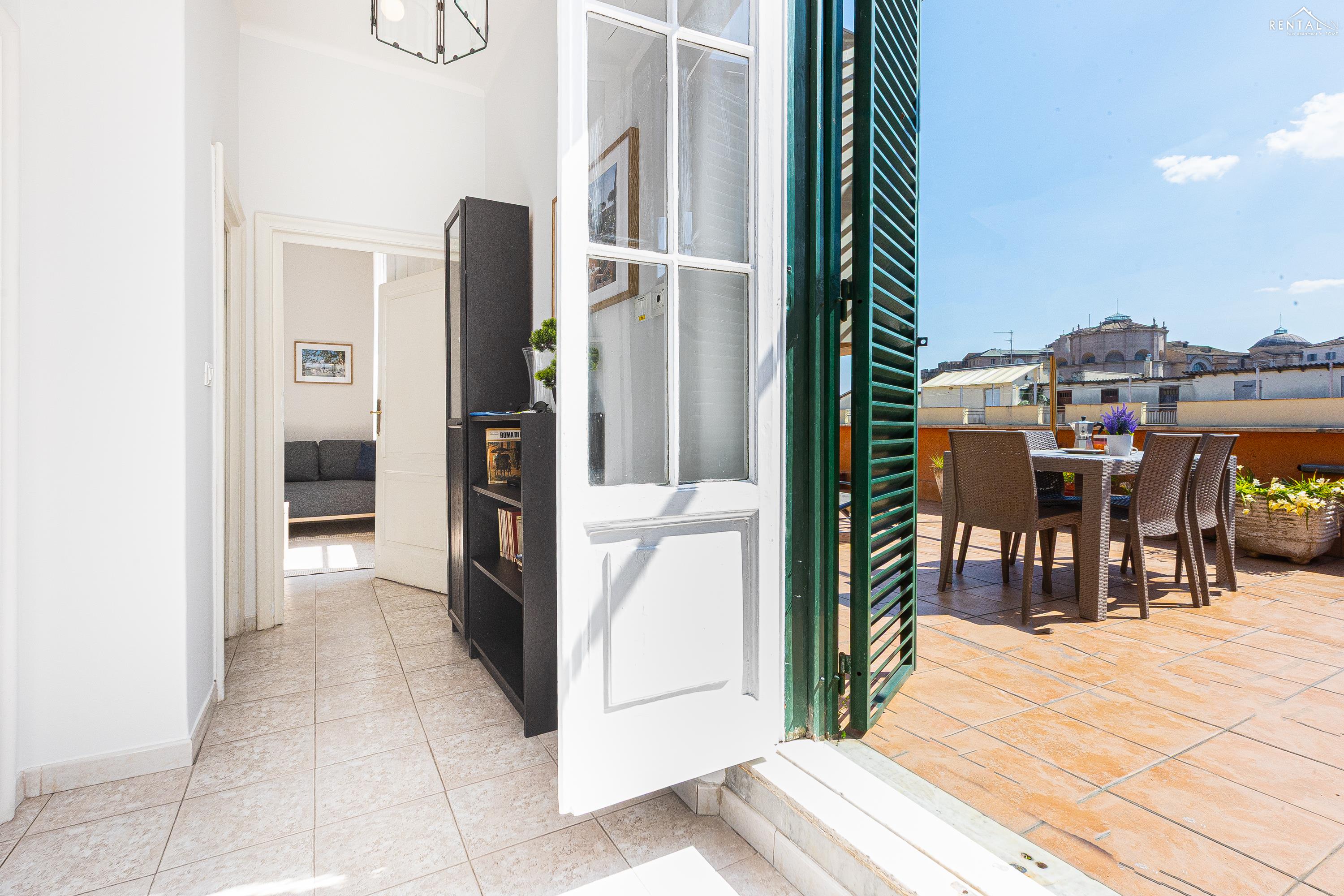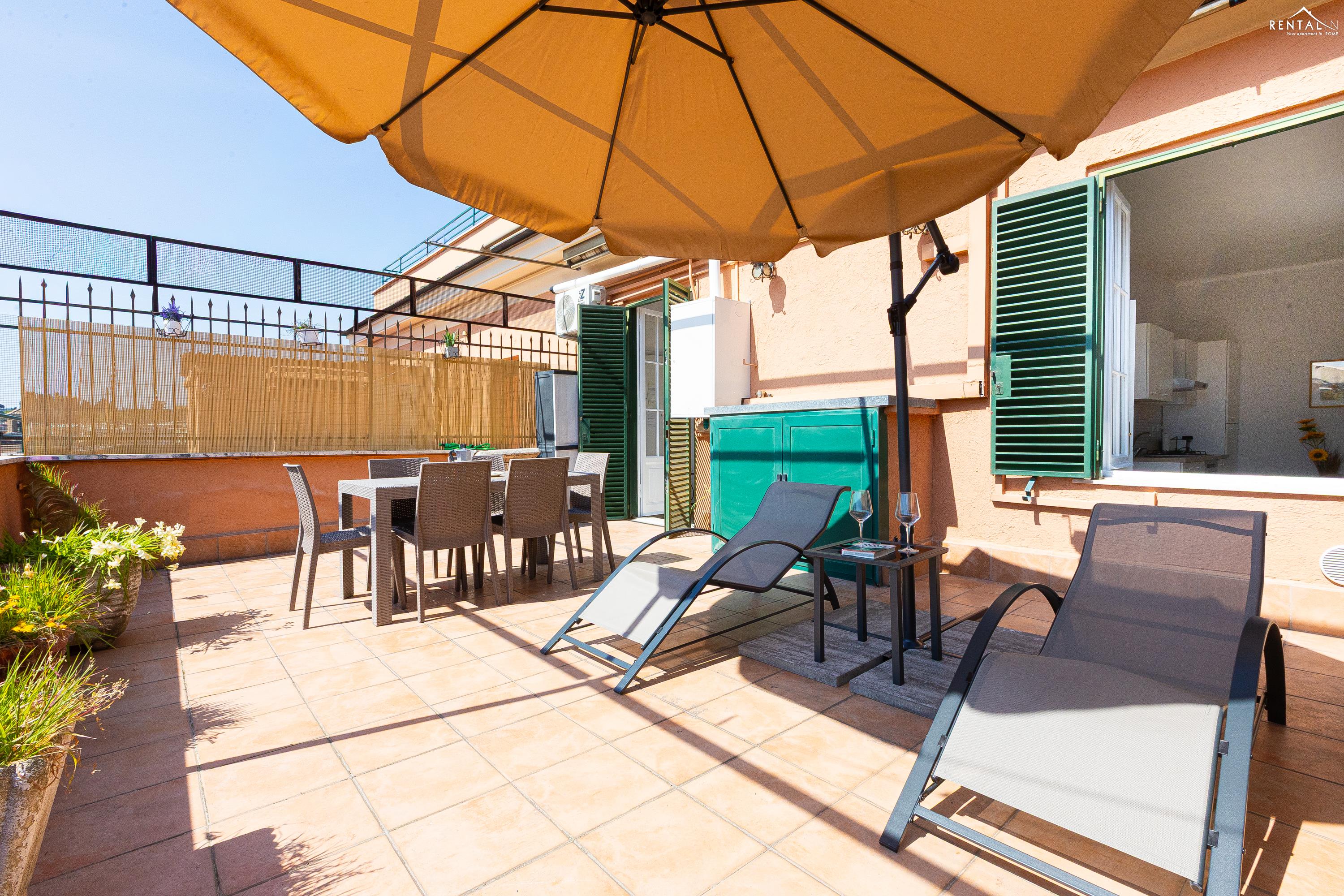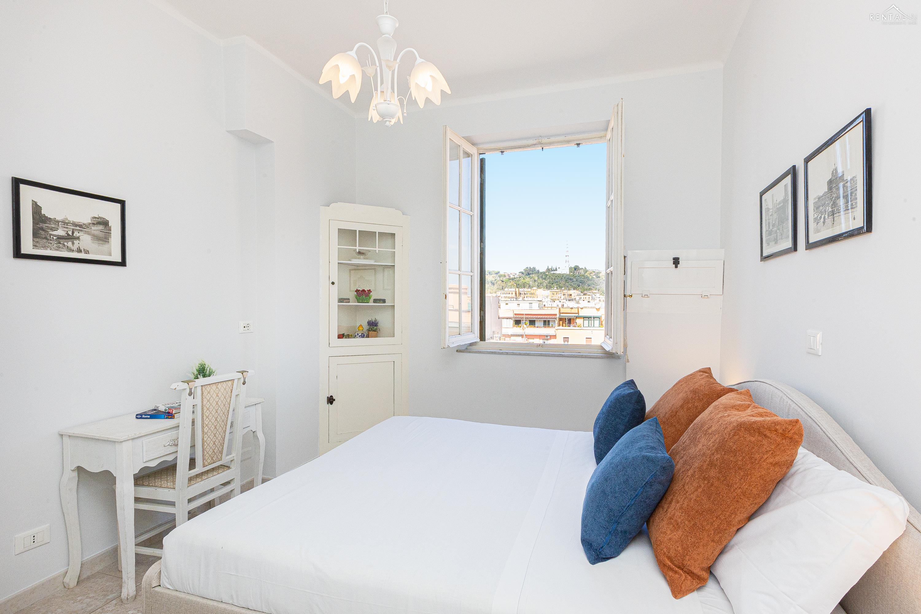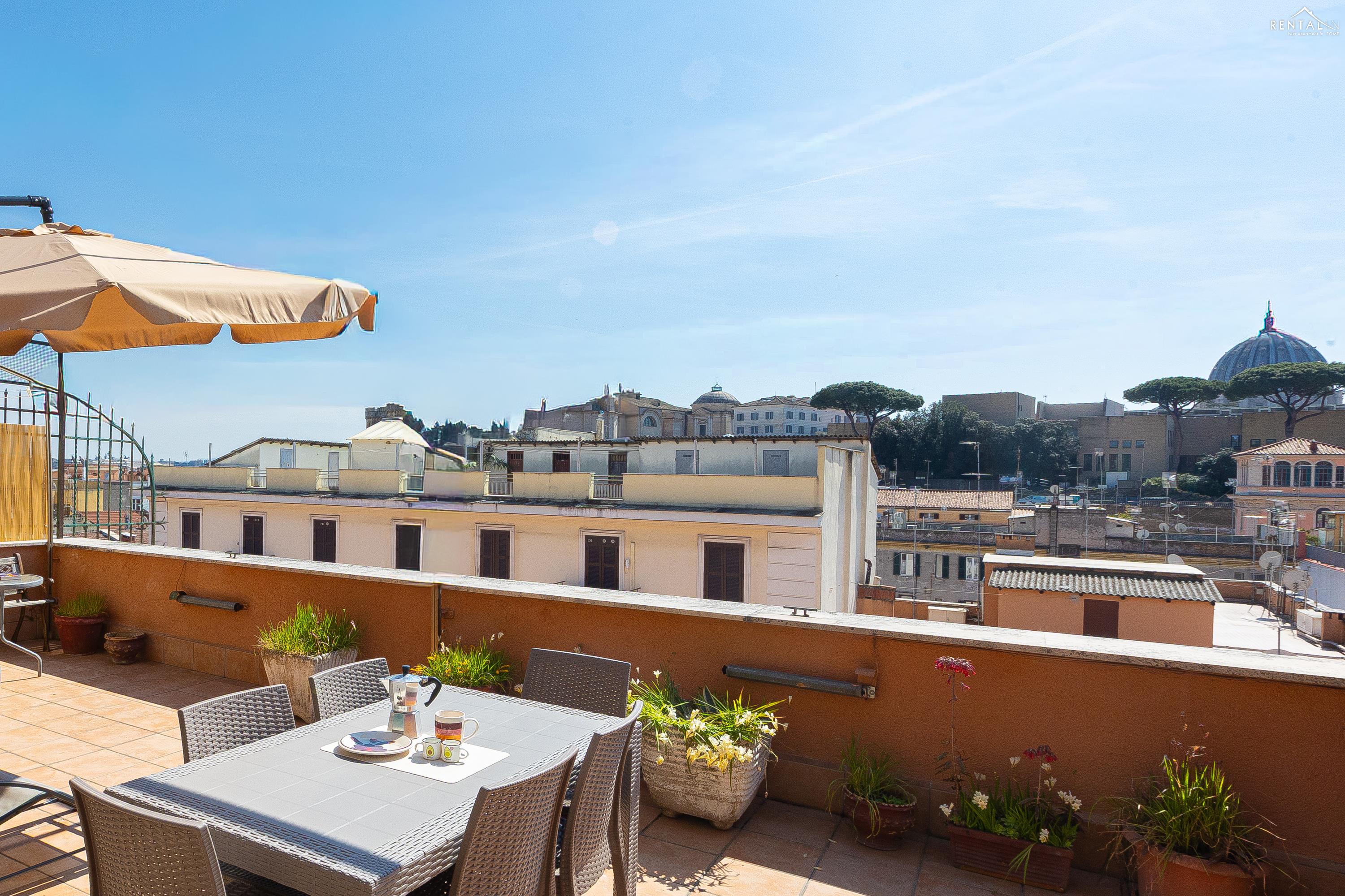 Gezellig appartement op de zevende verdieping van een gebouw met lift in Via la Goletta, in de elegante wijk Prati, op korte afstand van Sint Pieter Basiliek en de Vaticaanse Musea. Het is ingericht op een manier die modern en functioneel combineert en bestaat uit een slaapkamer met tweepersoonsbed, een woonkamer met een slaapbank en een keuken met moderne apparatuur, een badkamer met douche en een groot terras, ideaal om buiten te eten of te ontspannen de zon met een prachtig uitzicht over de daken van de stad en de koepel van de Sint Pieter. De voorzieningen zijn WiFi, een lcd-tv, een wasmachine en een kluisje. De centrale ligging met goede bereikbaarheid met het openbaar vervoer (metrolijn A Cipro is dichtbij) maakt het bij uitstek geschikt voor een aangename vakantie in de Eeuwige Stad.