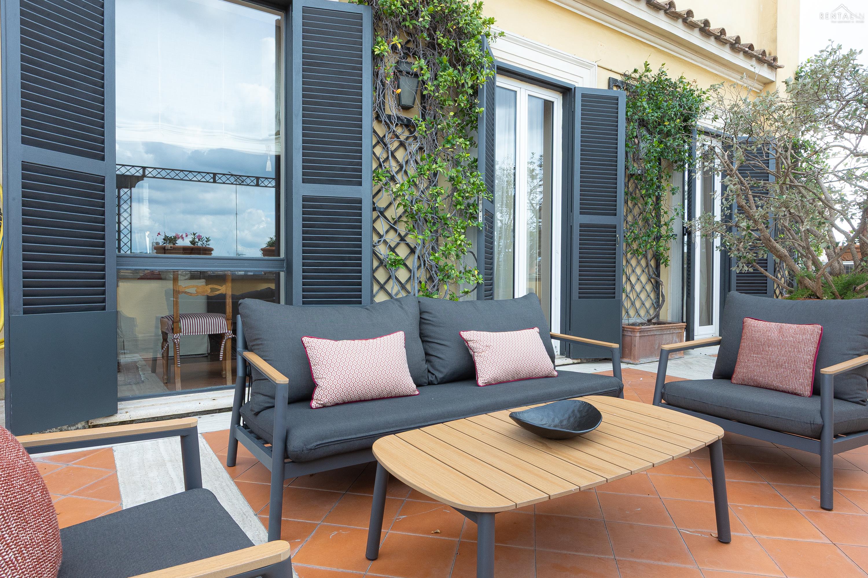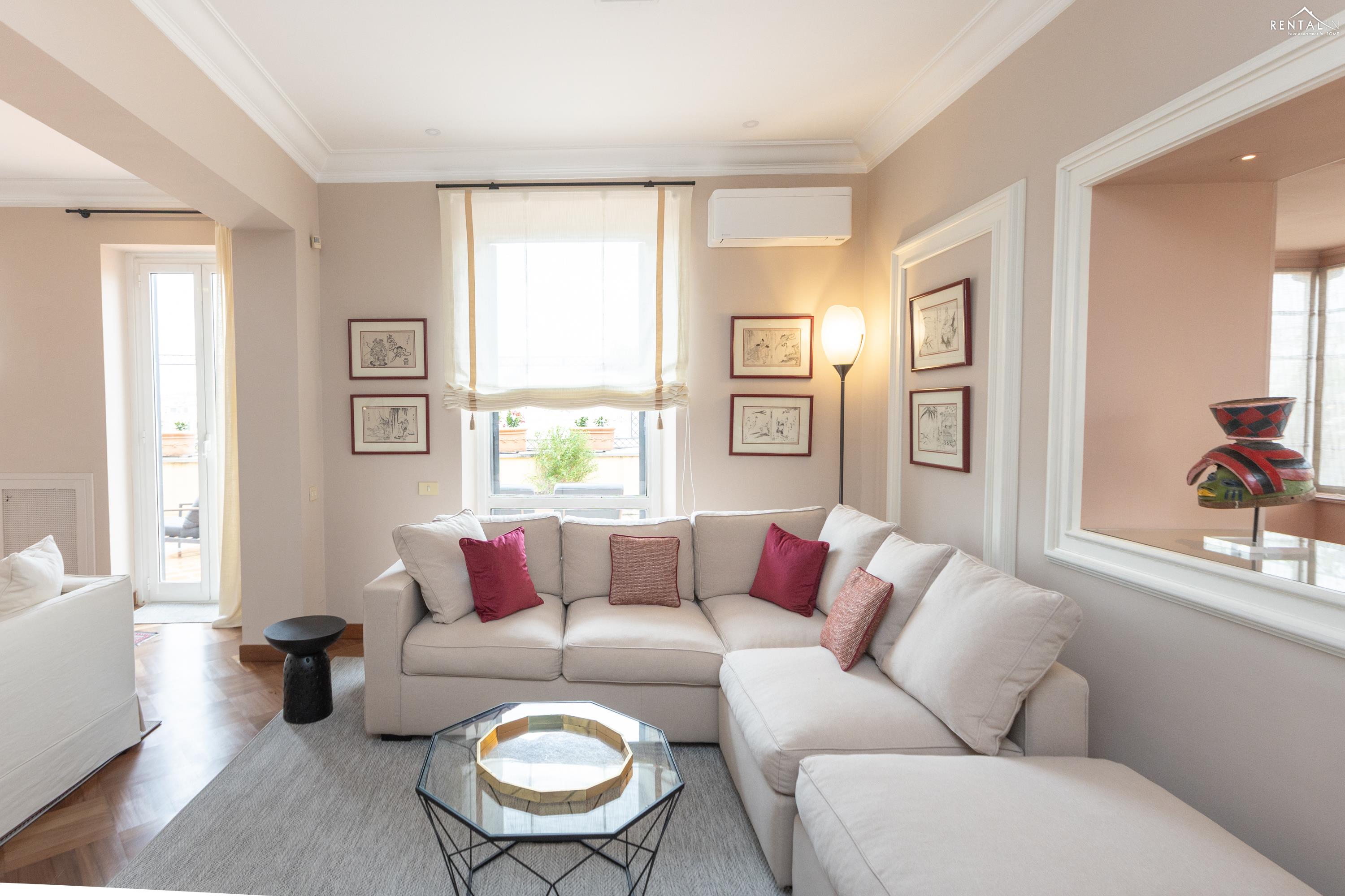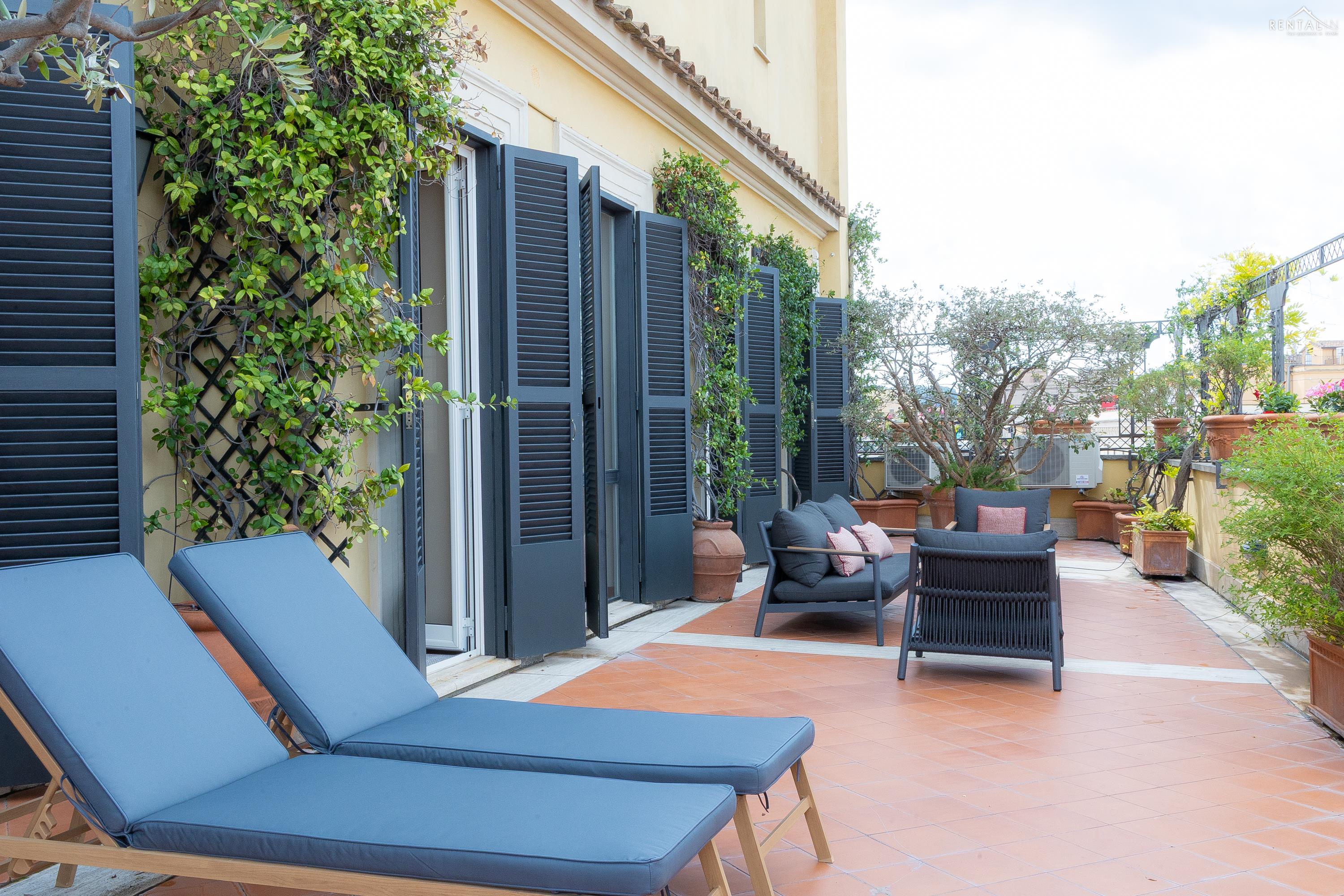 Prestigieus appartement met twee verdiepingen, gelegen op de vijfde verdieping met lift, in een paleis aan Largo Pietro di Brazzà, vlakbij de Trevifontein, het Palazzo del Quirinale en de winkelstraat Via del Corso. De benedenverdieping bestaat uit twee comfortabele tweepersoonsslaapkamers, een volledig uitgeruste keuken, een badkamer met douche, een tweede badkamer en een ruime en lichte woonkamer met eethoek en toegang tot een prachtig terras met een adembenemend uitzicht over de daken van Rome. Op de bovenverdieping, bereikbaar via een interne trap, bevinden zich nog een tweepersoonsslaapkamer met inloopkast en een badkamer met jacuzzi en douche. Alle kamers op deze verdieping bieden een ongelooflijk uitzicht op de schoonheid van de Eeuwige Stad, inclusief een glimp van de Trevifontein, de Sint-Pieterskoepel en het Vittoriano-paleis. Via een wenteltrap bereikt u ten slotte nog een terras met een uniek 360°-uitzicht over de stad. Dit appartement is voorzien van airconditioning, een lcd-tv, wifi, een wasmachine en een vaatwasser en kan zonder twijfel worden beschouwd als een kostbaar juweel in het hart van de mooiste stad ter wereld.