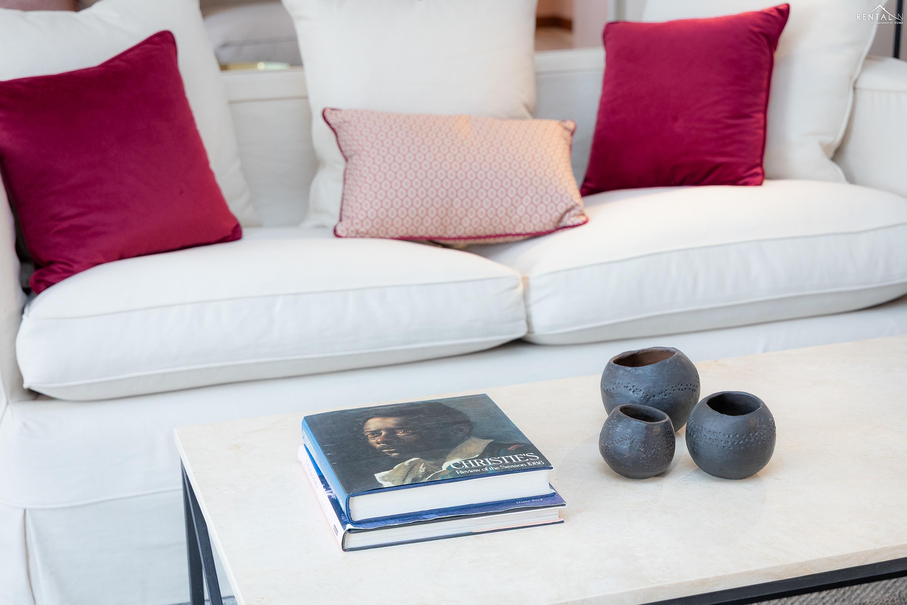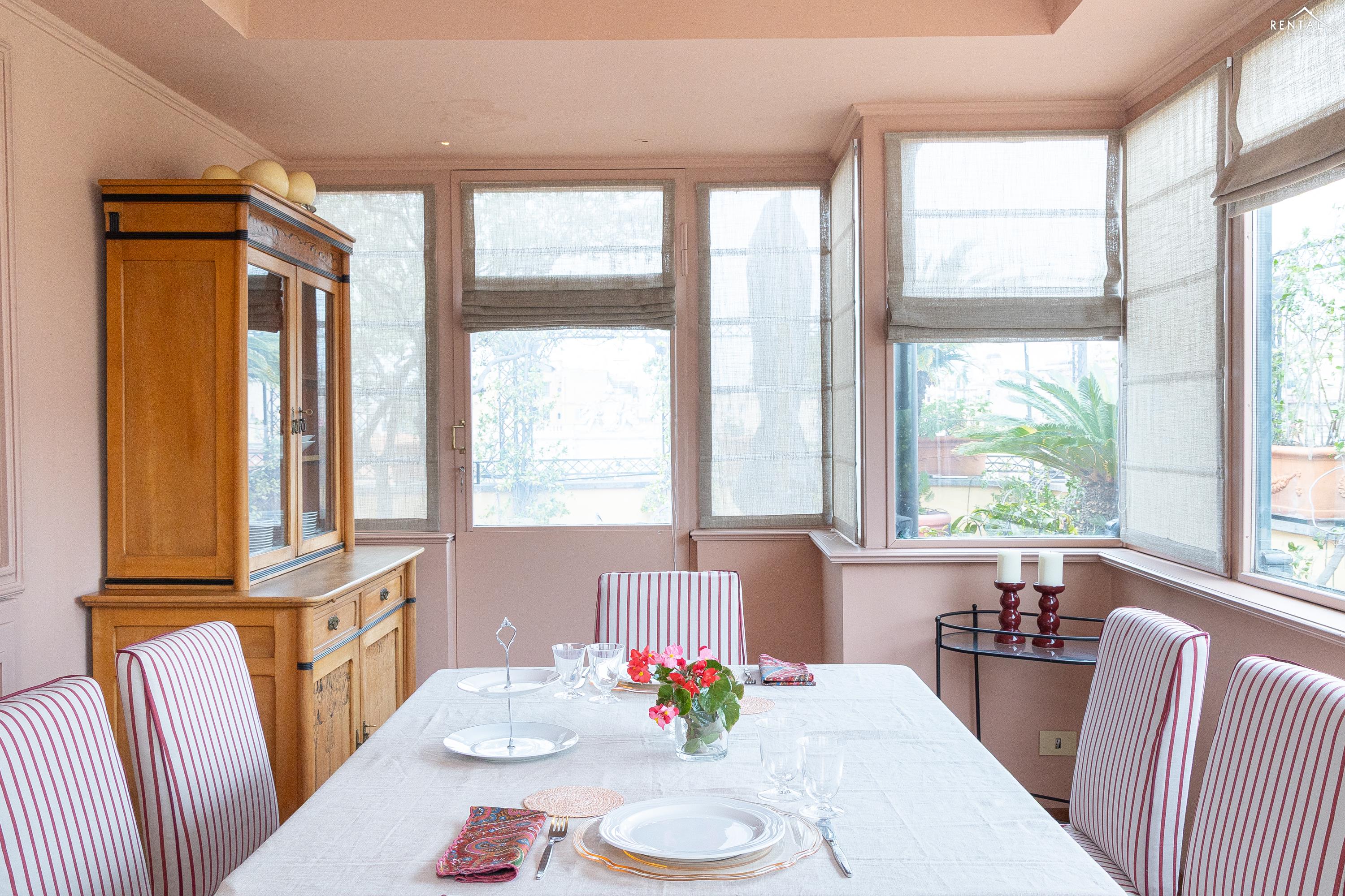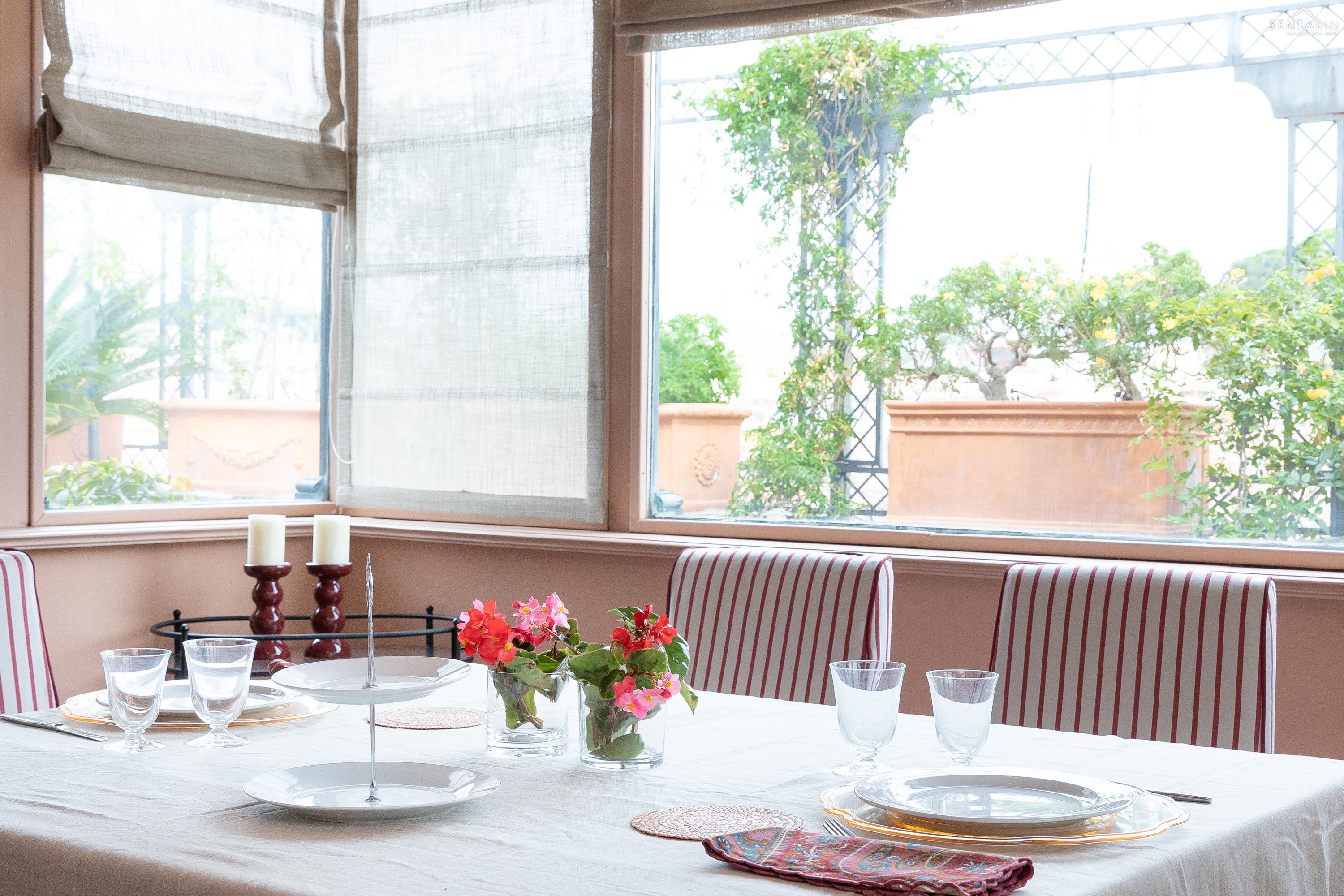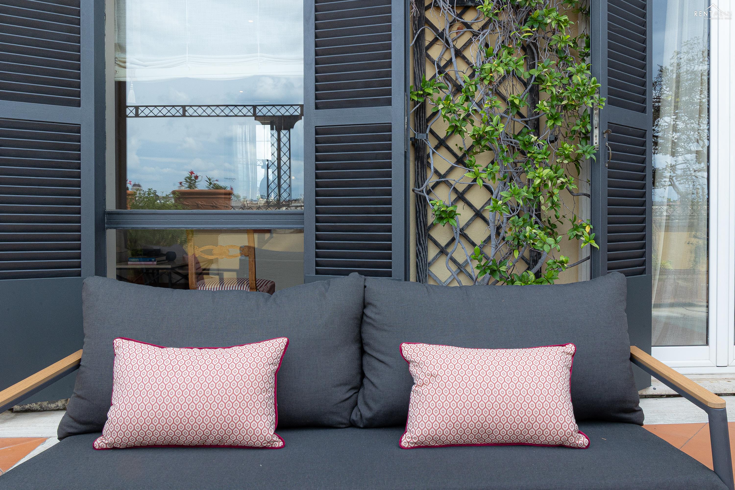 Prestigieus appartement met twee verdiepingen, gelegen op de vijfde verdieping met lift, in een paleis aan Largo Pietro di Brazzà, vlakbij de Trevifontein, het Palazzo del Quirinale en de winkelstraat Via del Corso. De benedenverdieping bestaat uit twee comfortabele tweepersoonsslaapkamers, een volledig uitgeruste keuken, een badkamer met douche, een tweede badkamer en een ruime en lichte woonkamer met eethoek en toegang tot een prachtig terras met een adembenemend uitzicht over de daken van Rome. Op de bovenverdieping, bereikbaar via een interne trap, bevinden zich nog een tweepersoonsslaapkamer met inloopkast en een badkamer met jacuzzi en douche. Alle kamers op deze verdieping bieden een ongelooflijk uitzicht op de schoonheid van de Eeuwige Stad, inclusief een glimp van de Trevifontein, de Sint-Pieterskoepel en het Vittoriano-paleis. Via een wenteltrap bereikt u ten slotte nog een terras met een uniek 360°-uitzicht over de stad. Dit appartement is voorzien van airconditioning, een lcd-tv, wifi, een wasmachine en een vaatwasser en kan zonder twijfel worden beschouwd als een kostbaar juweel in het hart van de mooiste stad ter wereld.
