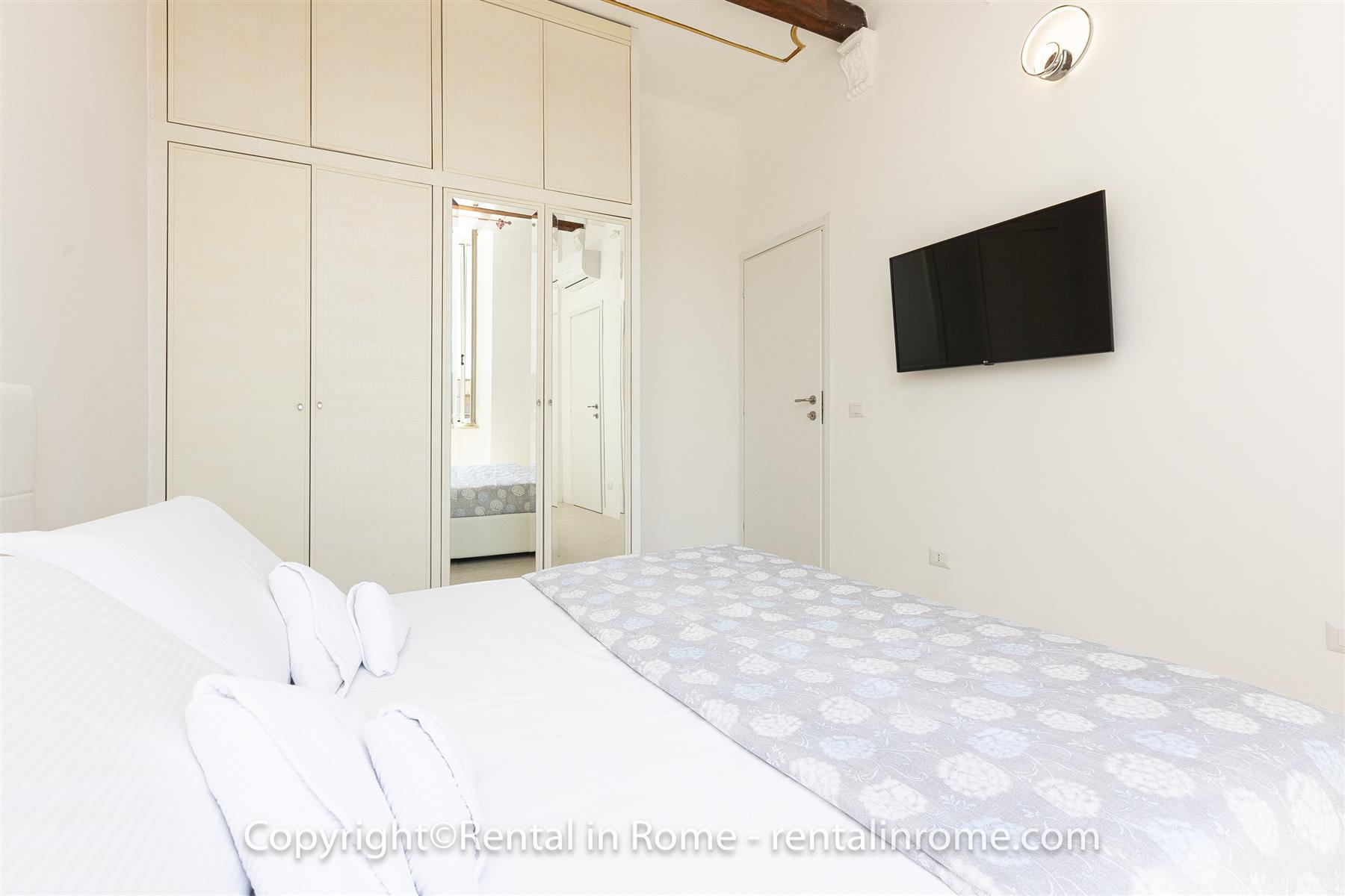 Die Wohnung besteht aus einem Wohnzimmer mit einem Schlafsofa, einem Schlafzimmer mit Doppelbett und großem Bad mit Dusche, einem zweiten Schlafzimmer mit Doppelbett, einem zweiten Badezimmer ohne Dusche, einer modernen und voll ausgestatteten Küchenzeile. Die Wohnung verfügt außerdem über Klimaanlage, WLAN und Waschmaschine und Geschirrspüler. Die absolut zentrale und exklusive Lage machen es zu einer idealen Wohnlösung für einen unvergesslichen Urlaub in der Ewigen Stadt.