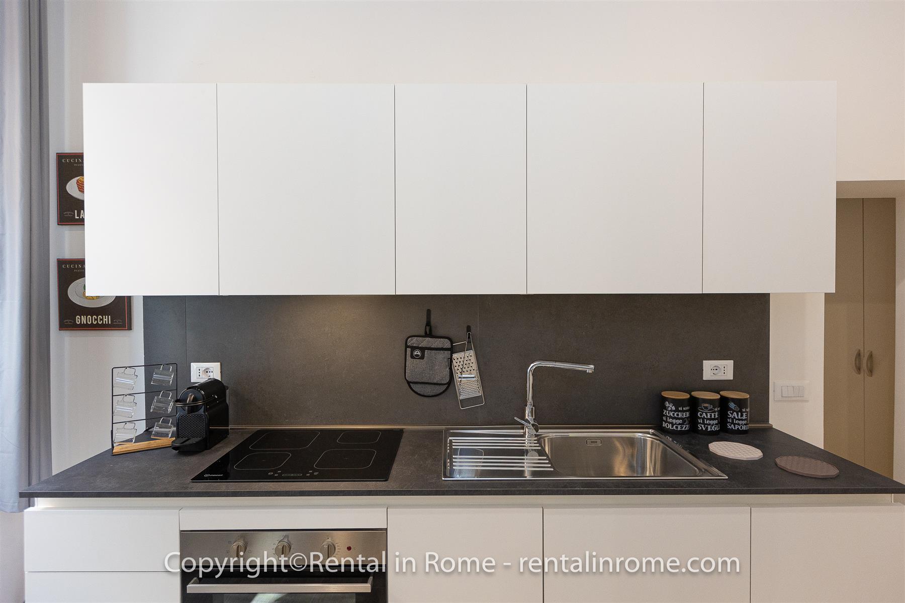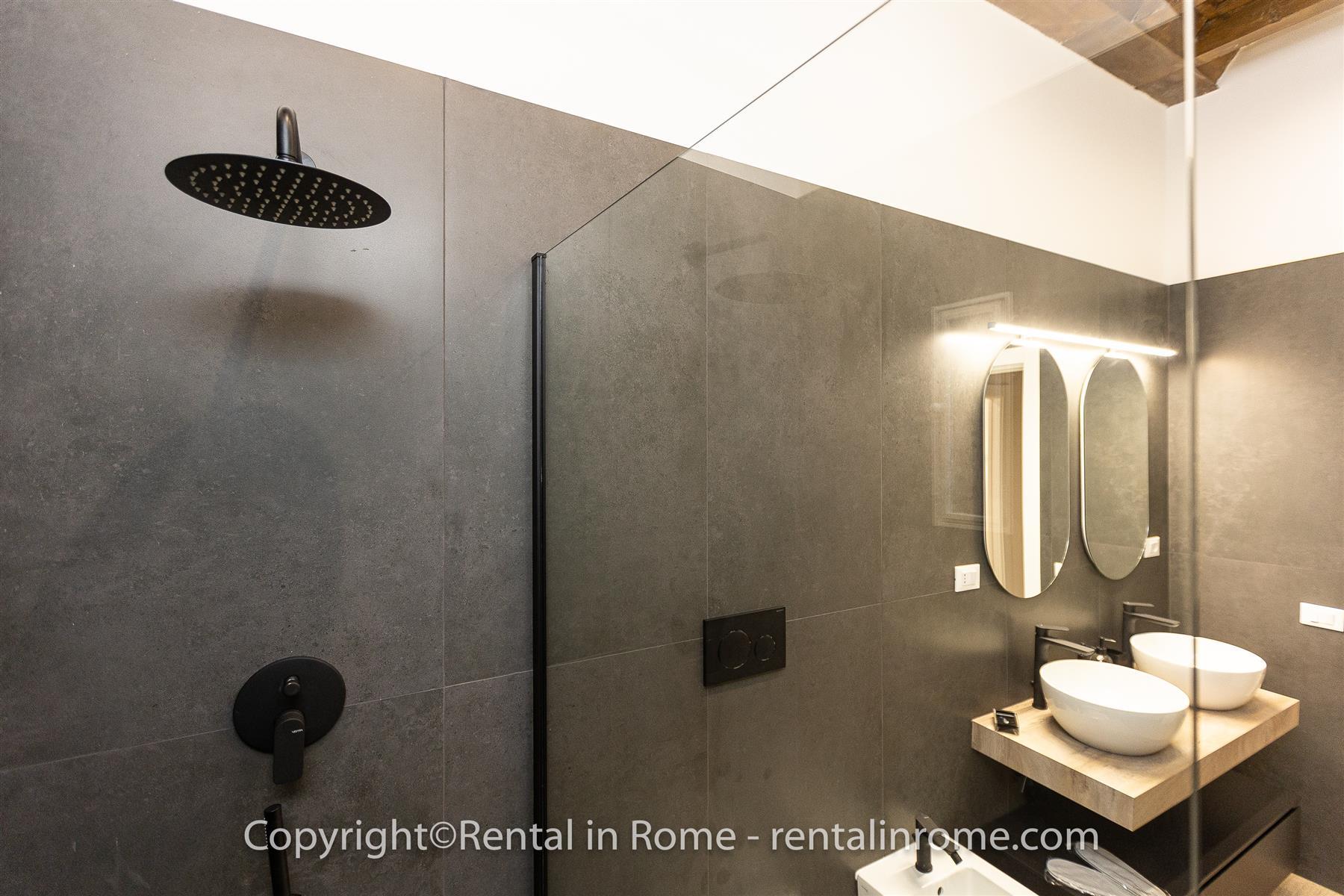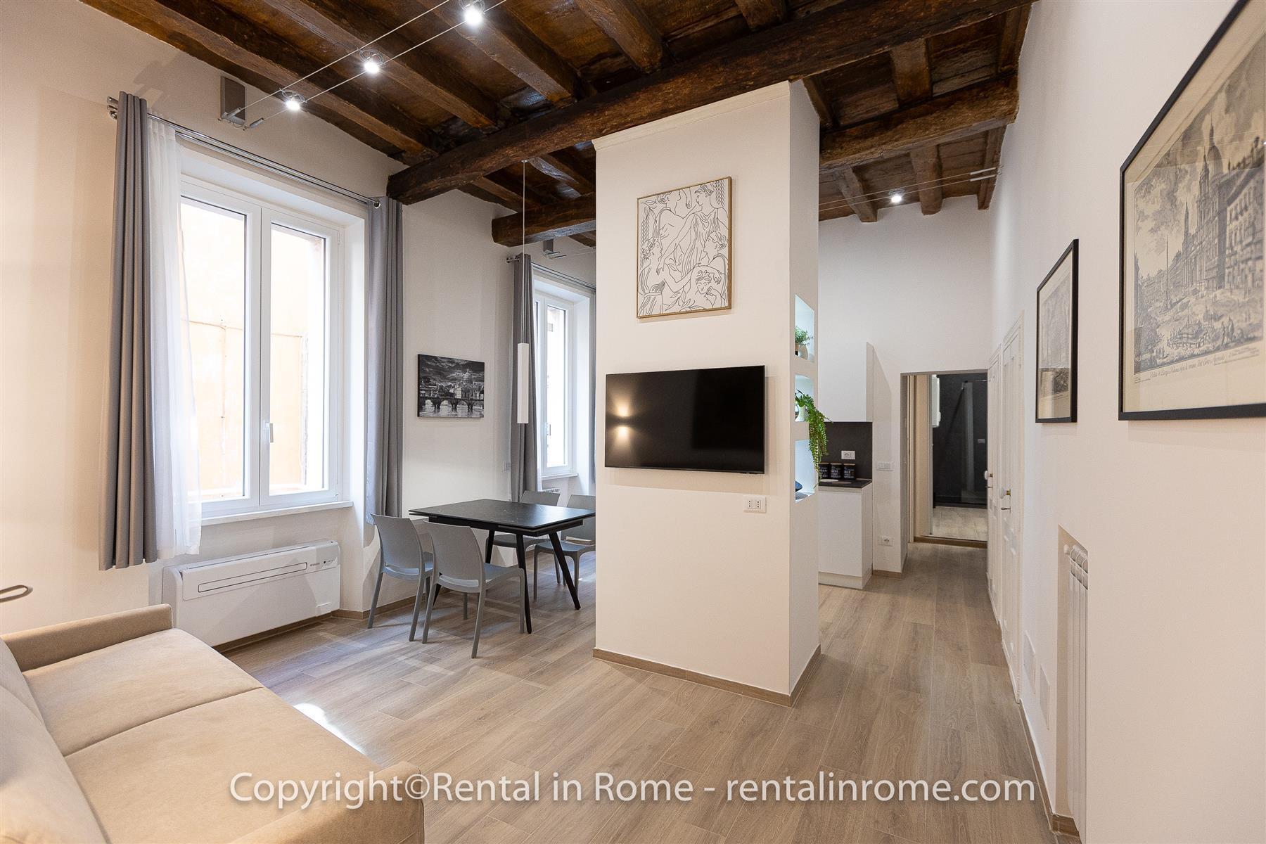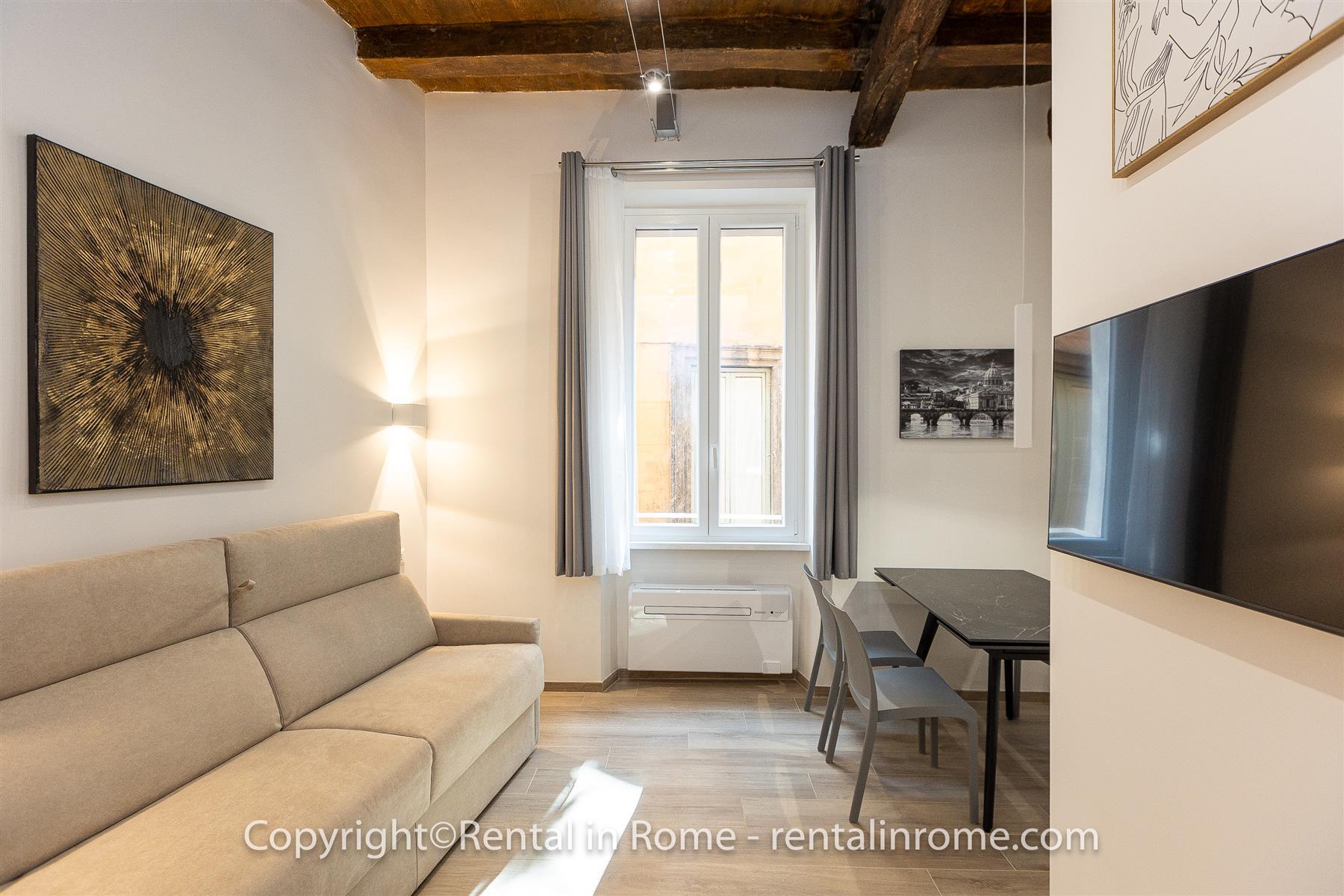 Excelente apartamento completamente reformado, localizado no coração do centro histórico de Roma, exatamente na Via della Vetrina, a poucos passos da Piazza Navona, Panteão, Campo De Fiori. O imóvel situa-se no primeiro andar de um pequeno e histórico edifício sem elevador, a localização é perfeita para percorrer facilmente todo o centro histórico a pé, podendo chegar confortavelmente aos principais pontos de interesse em poucos minutos. O imóvel é composto por uma ampla sala de estar, equipada com sofá-cama e Smart TV, uma kitchenette totalmente equipada. Todo o apartamento tem um tecto em caixotões com vigas de madeira que dão um toque de historicidade a esta casa única. O apartamento é completado por uma grande casa de banho com lavatório duplo e chuveiro grande, um confortável quarto duplo de alta qualidade. cama e escrivaninha. O imóvel está equipado com todo o conforto como ar condicionado, smart TV, wi-fi, máquina de lavar roupa e loiça. Perfeito para casais que desejam passar uma estadia inesquecível em um apartamento localizado no centro histórico da Cidade Eterna.