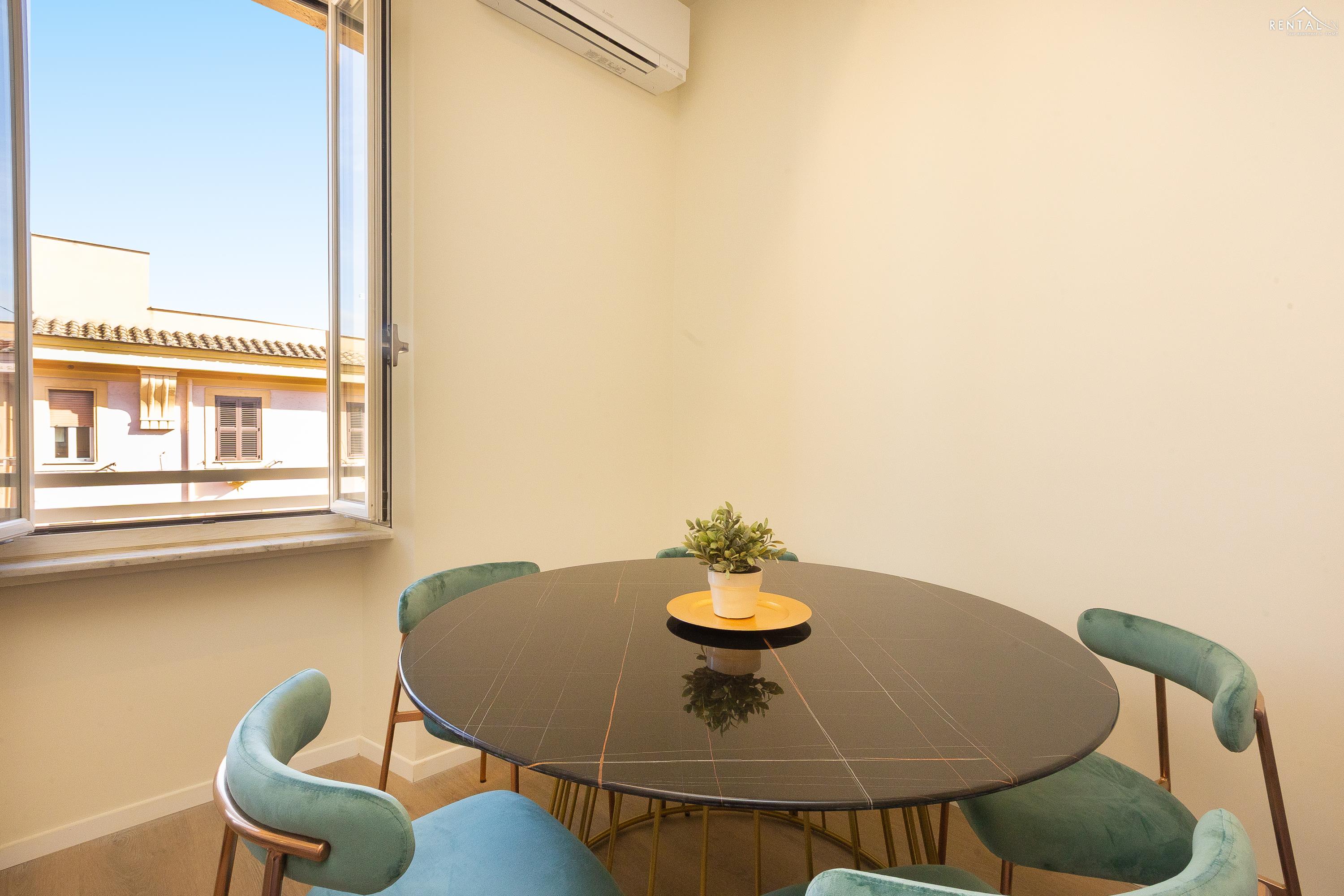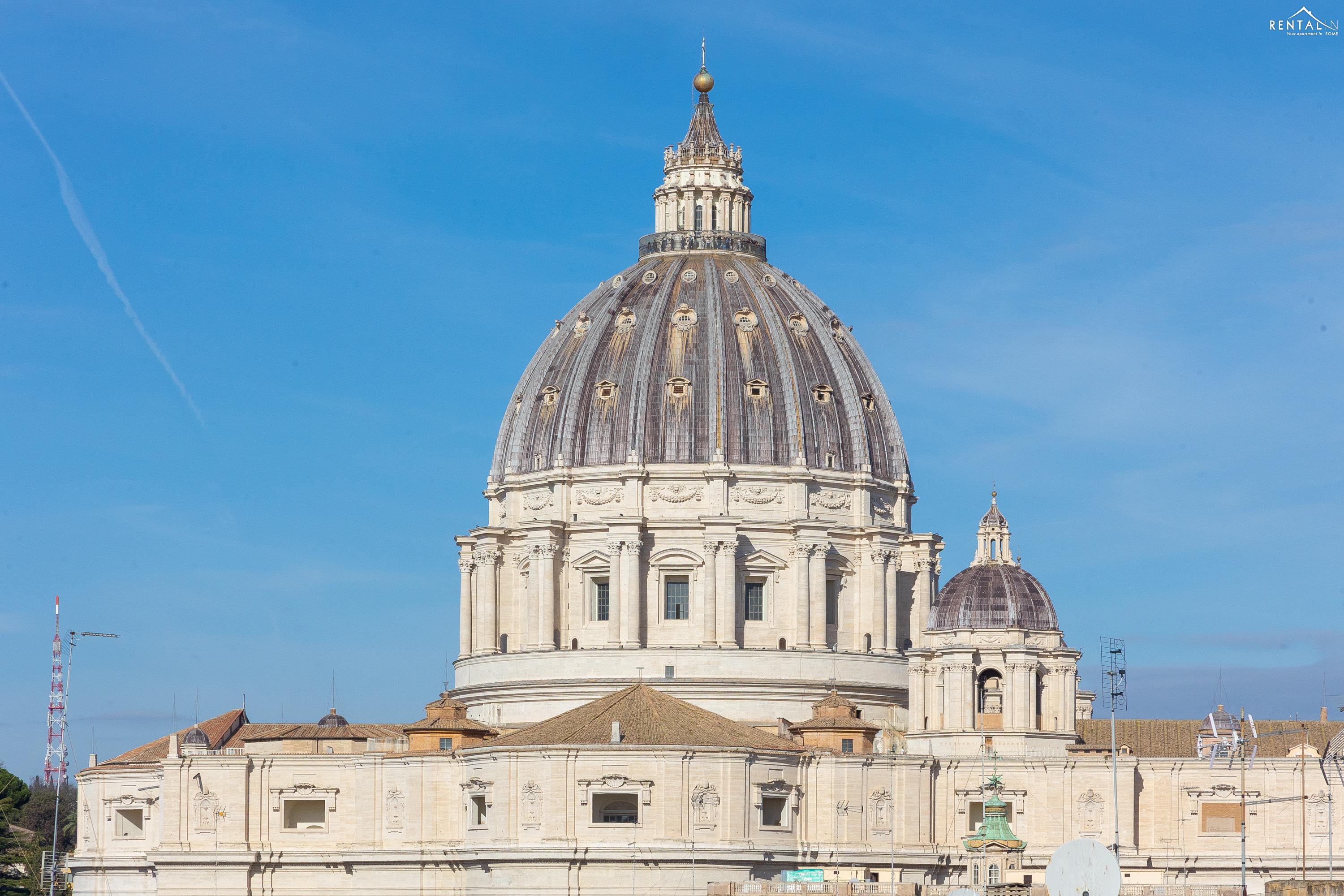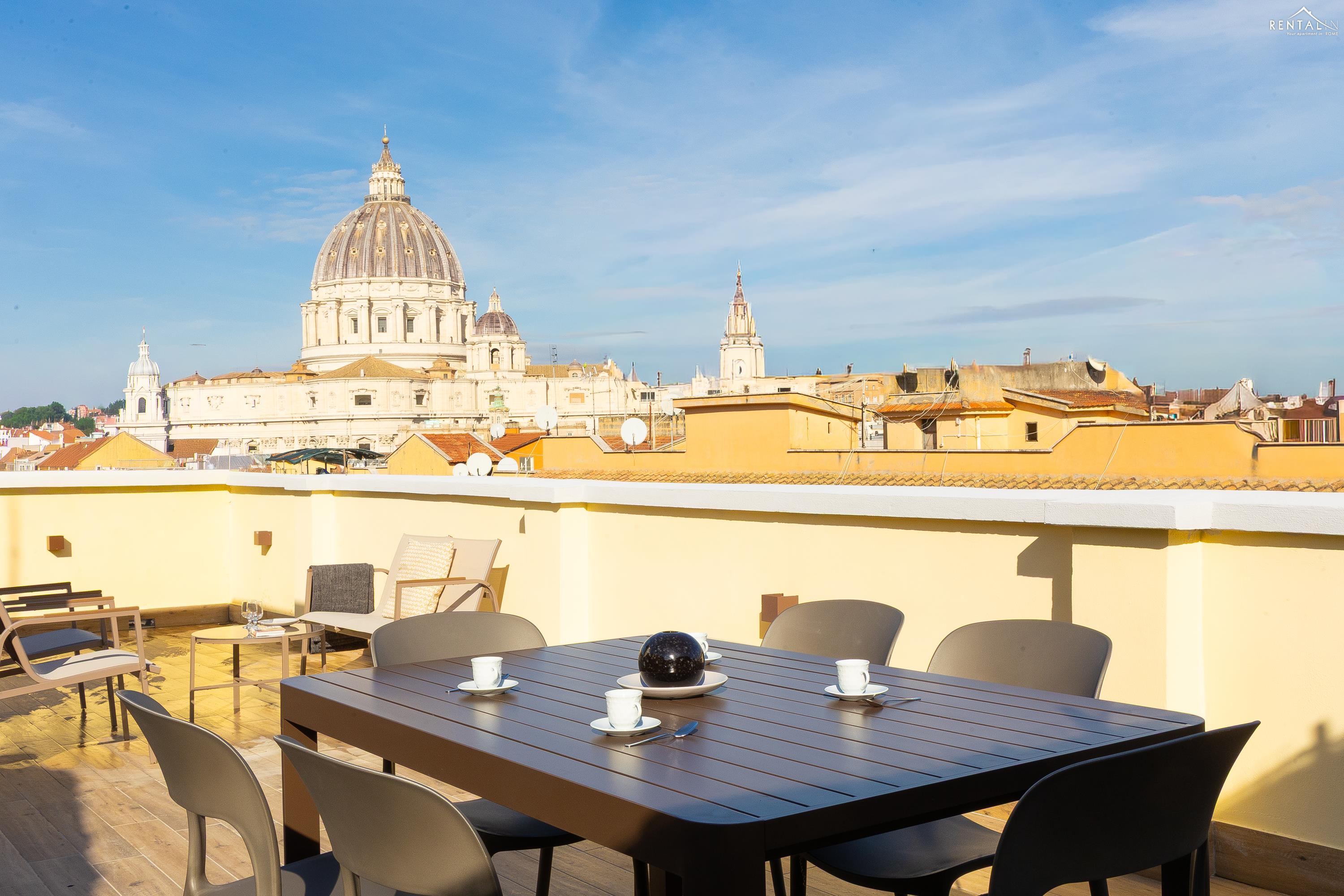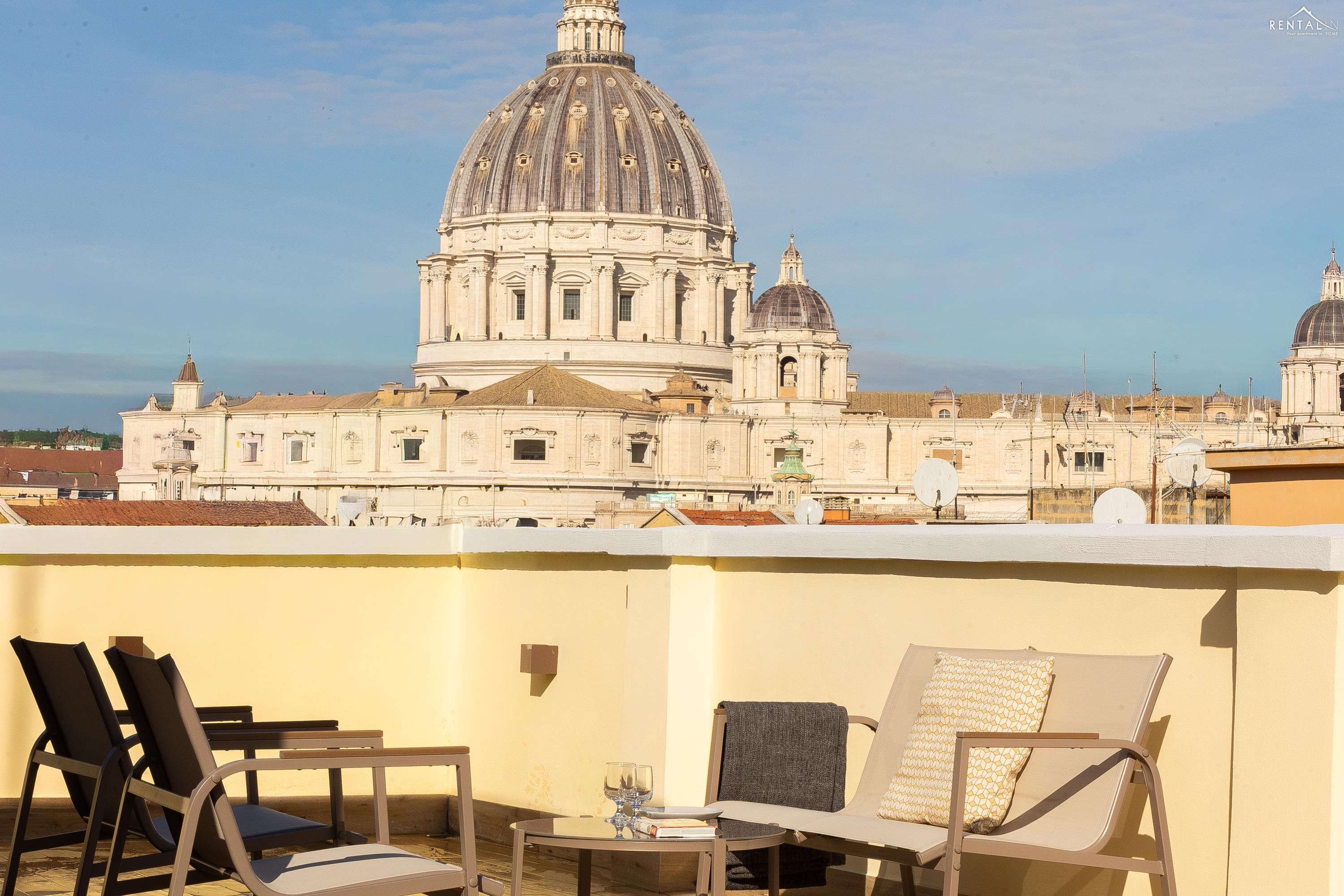 Cet élégant appartement se situe au cinquième étage d'un immeuble avec ascenseur et service de conciergerie, Via Nicolò III, à deux pas de la basilique Saint-Pierre, des musées du Vatican et de la gare de Roma San Pietro. Meublé dans un style moderne et baigné de lumière, il comprend deux chambres doubles confortables, un vaste séjour avec canapé-lit, une kitchenette entièrement équipée, une salle de bains avec douche et des toilettes invités avec douche. La terrasse, située au dernier étage et accessible par l'escalier commun ou par l'ascenseur intérieur, est idéale pour les repas en plein air et la détente au soleil, tout en offrant une vue splendide sur le dôme de Saint-Pierre. Ses équipements, tels que la climatisation, le Wi-Fi, une télévision, un lave-linge et un lave-vaisselle, ainsi que son emplacement central et sa proximité avec un réseau de transports en commun performant, en font le lieu idéal pour un merveilleux séjour dans la Ville Éternelle.