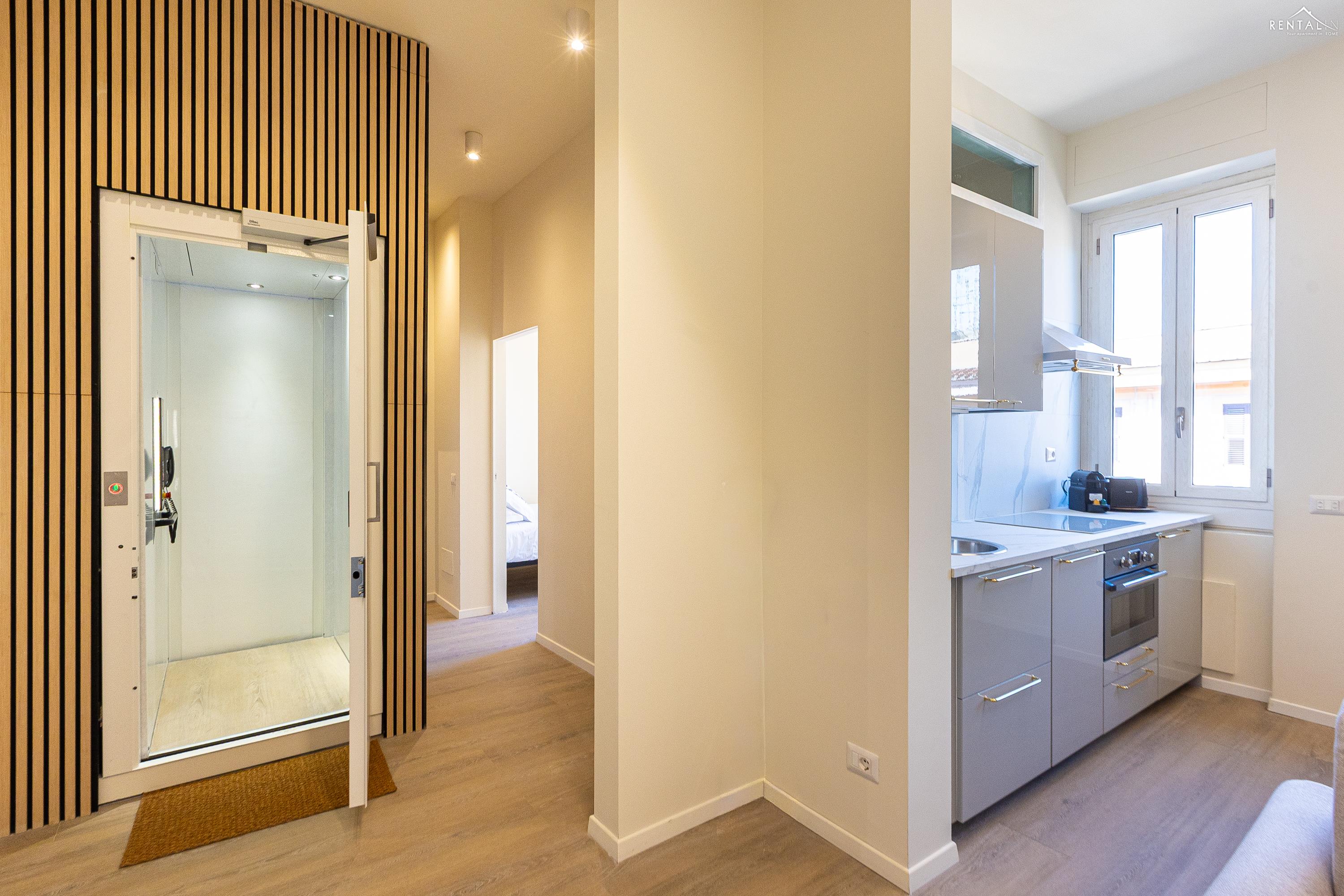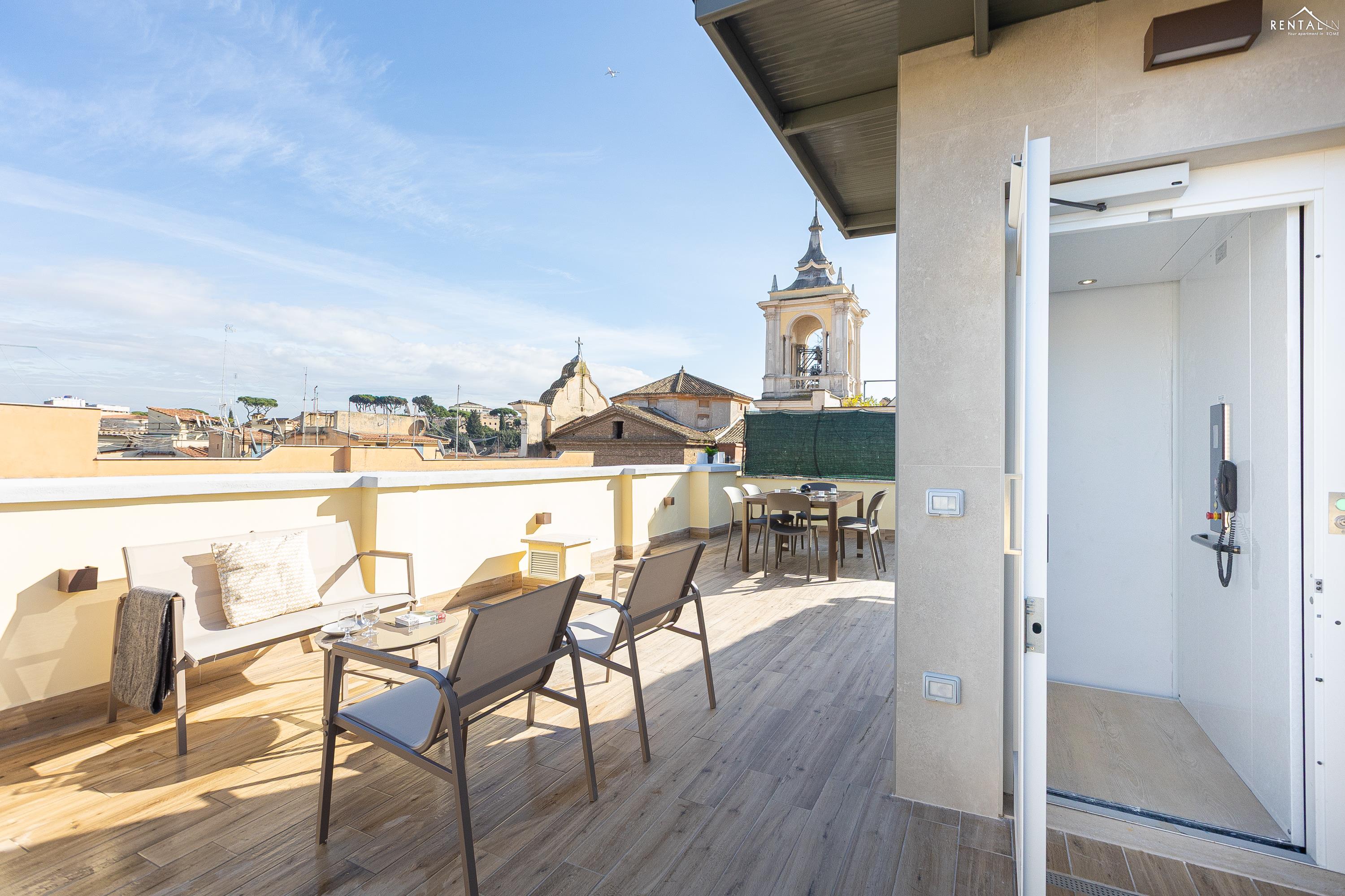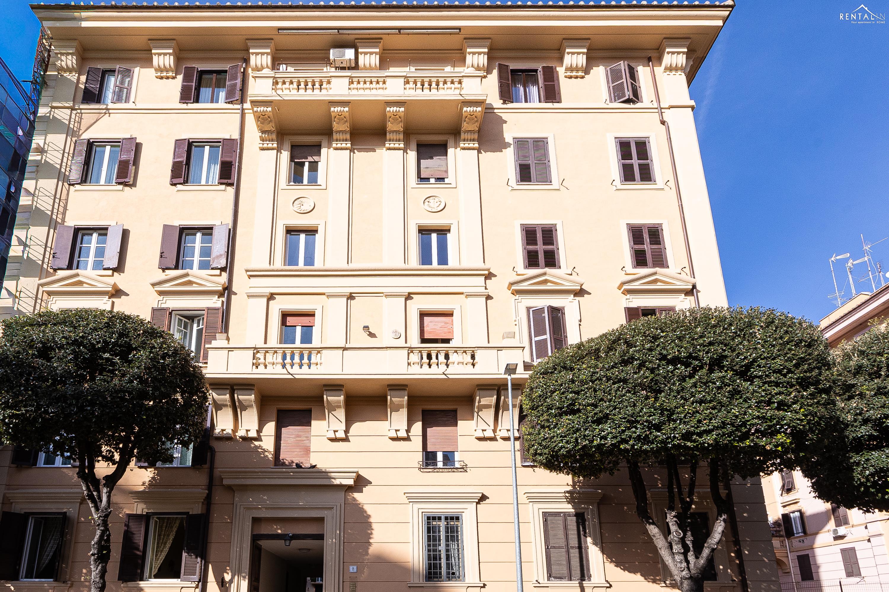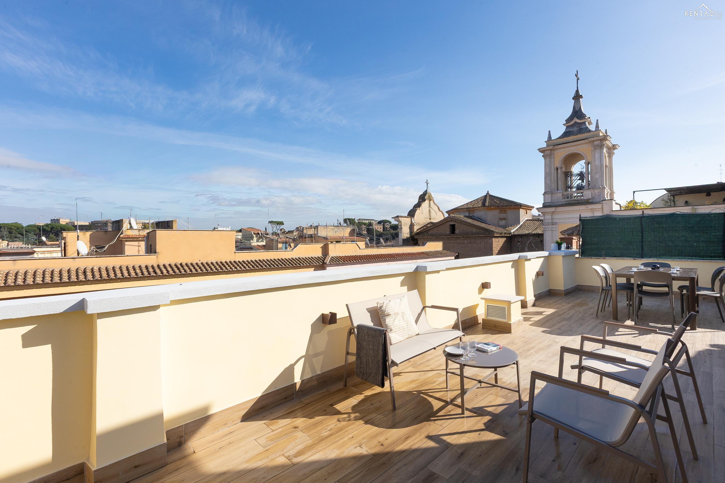 Cet élégant appartement se situe au cinquième étage d'un immeuble avec ascenseur et service de conciergerie, Via Nicolò III, à deux pas de la basilique Saint-Pierre, des musées du Vatican et de la gare de Roma San Pietro. Meublé dans un style moderne et baigné de lumière, il comprend deux chambres doubles confortables, un vaste séjour avec canapé-lit, une kitchenette entièrement équipée, une salle de bains avec douche et des toilettes invités avec douche. La terrasse, située au dernier étage et accessible par l'escalier commun ou par l'ascenseur intérieur, est idéale pour les repas en plein air et la détente au soleil, tout en offrant une vue splendide sur le dôme de Saint-Pierre. Ses équipements, tels que la climatisation, le Wi-Fi, une télévision, un lave-linge et un lave-vaisselle, ainsi que son emplacement central et sa proximité avec un réseau de transports en commun performant, en font le lieu idéal pour un merveilleux séjour dans la Ville Éternelle.